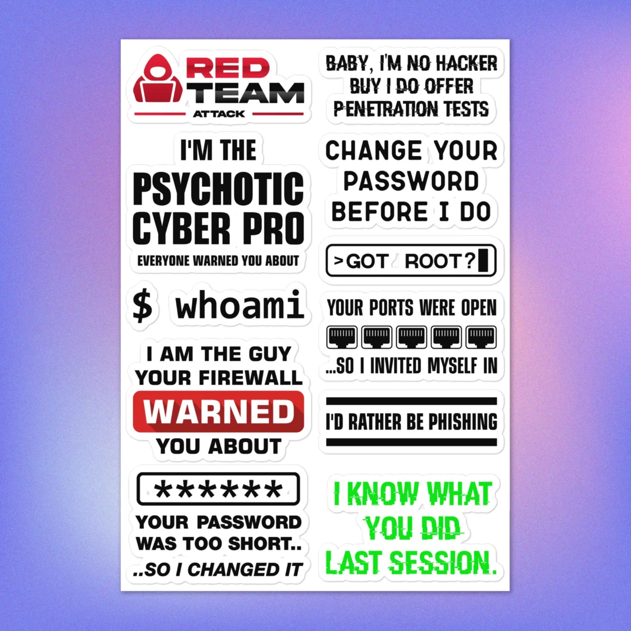 #RedTeamStickers #HackerSayings #PenetrationTesterGift #GotRootSticker #CyberSecurityHumor #LaptopStickersPack #WhoamiSticker #HackerLife #NetworkSecurity #EthicalHackerGift