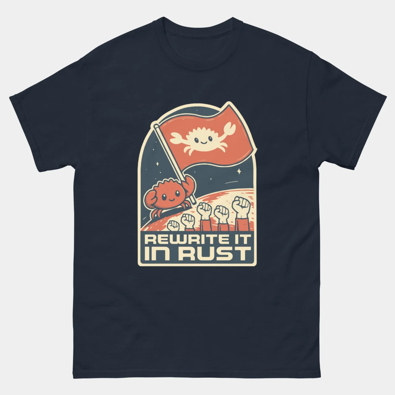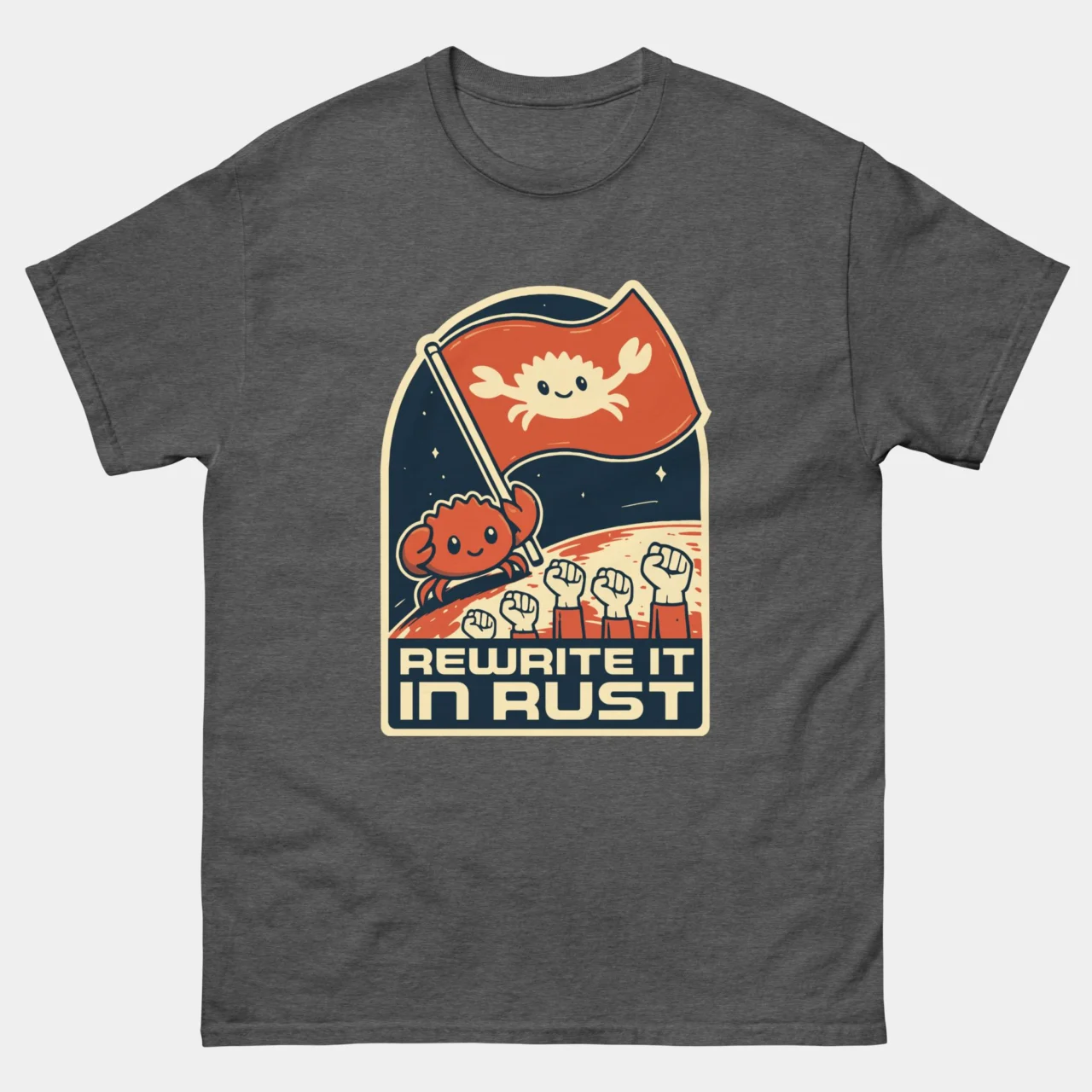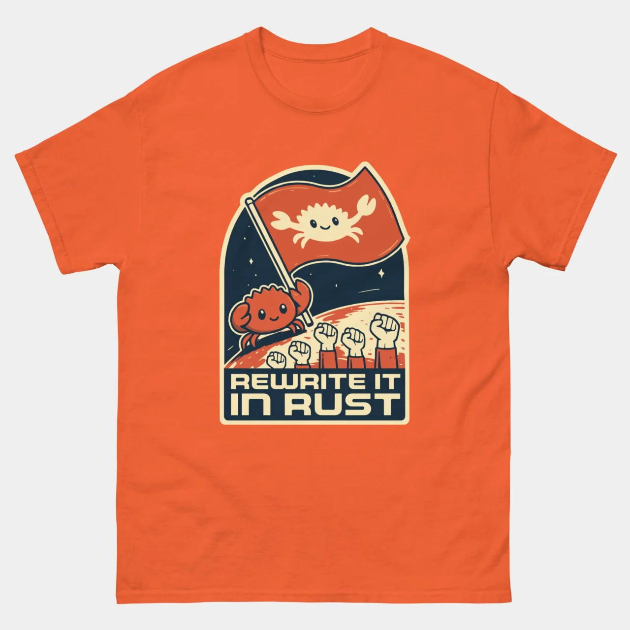 This tee is a badge of honor for Rustaceans, systems programmers, and anyone who loves that speedy, memory-safe language with the iconic crab mascot.