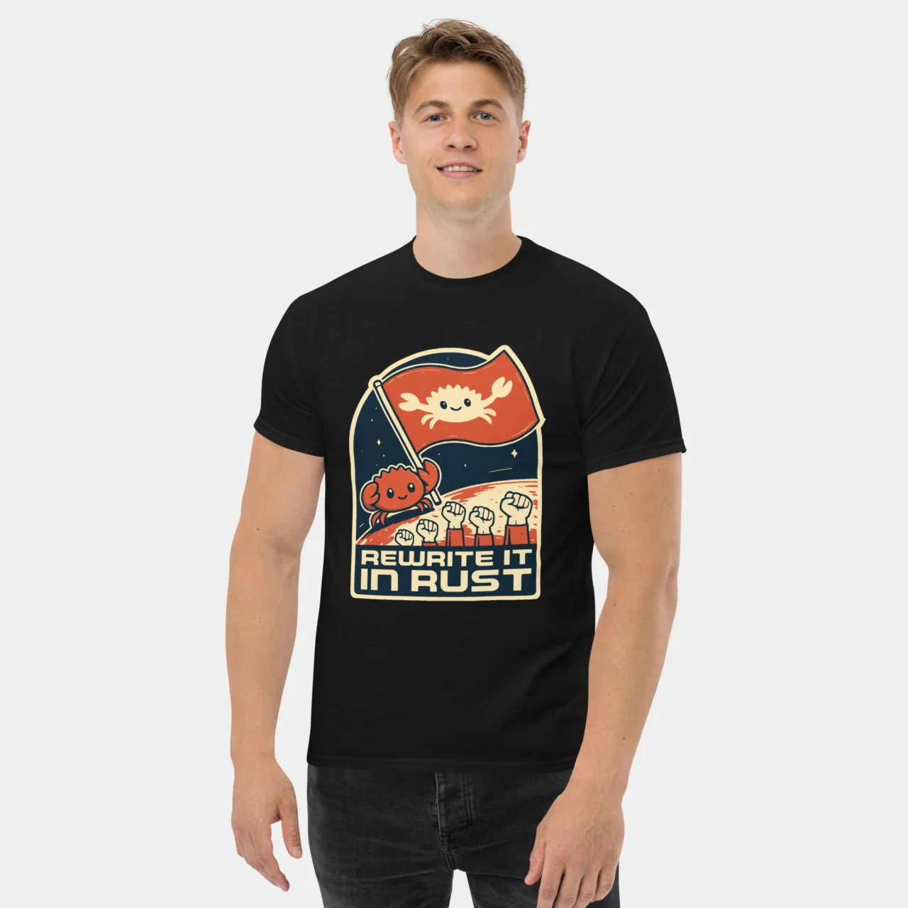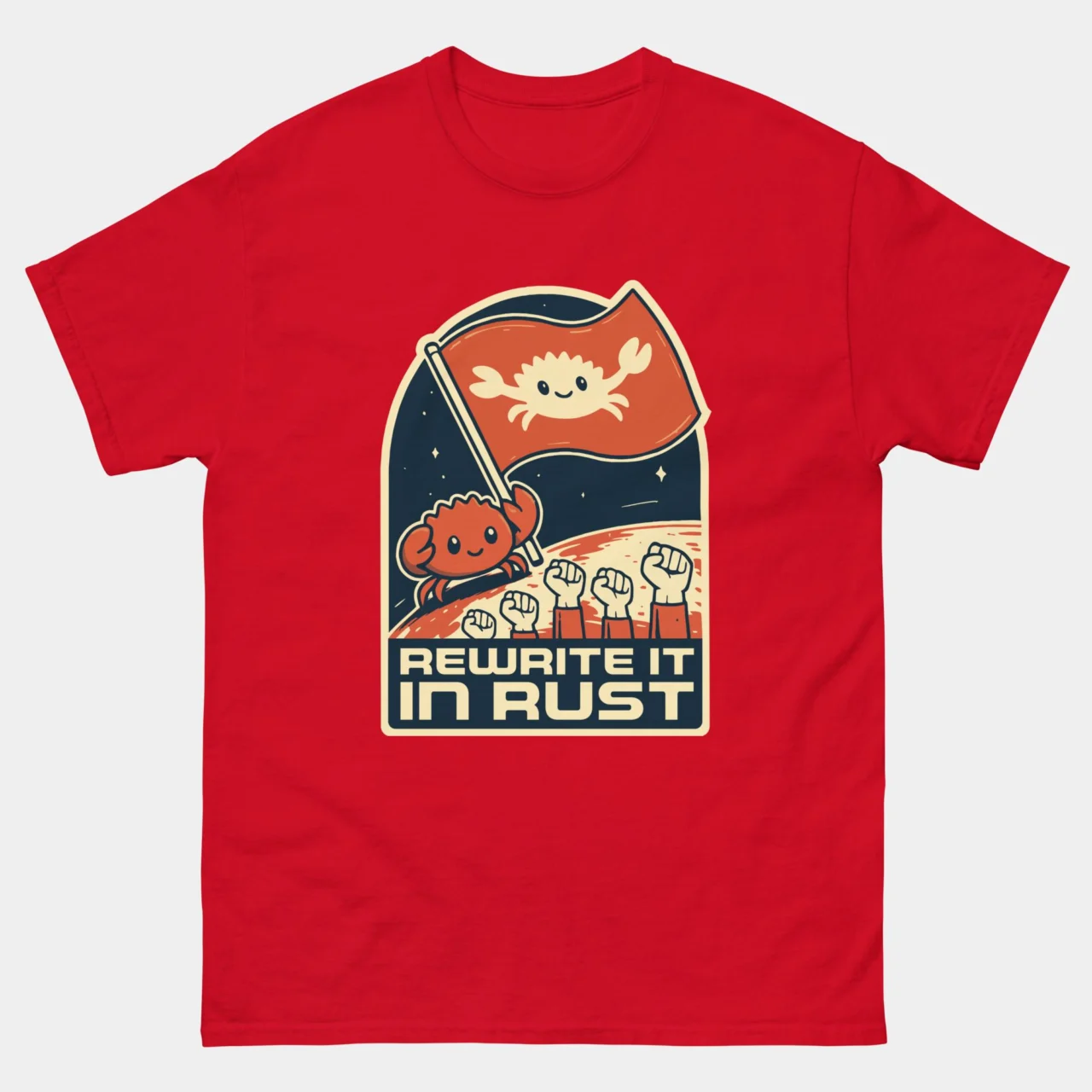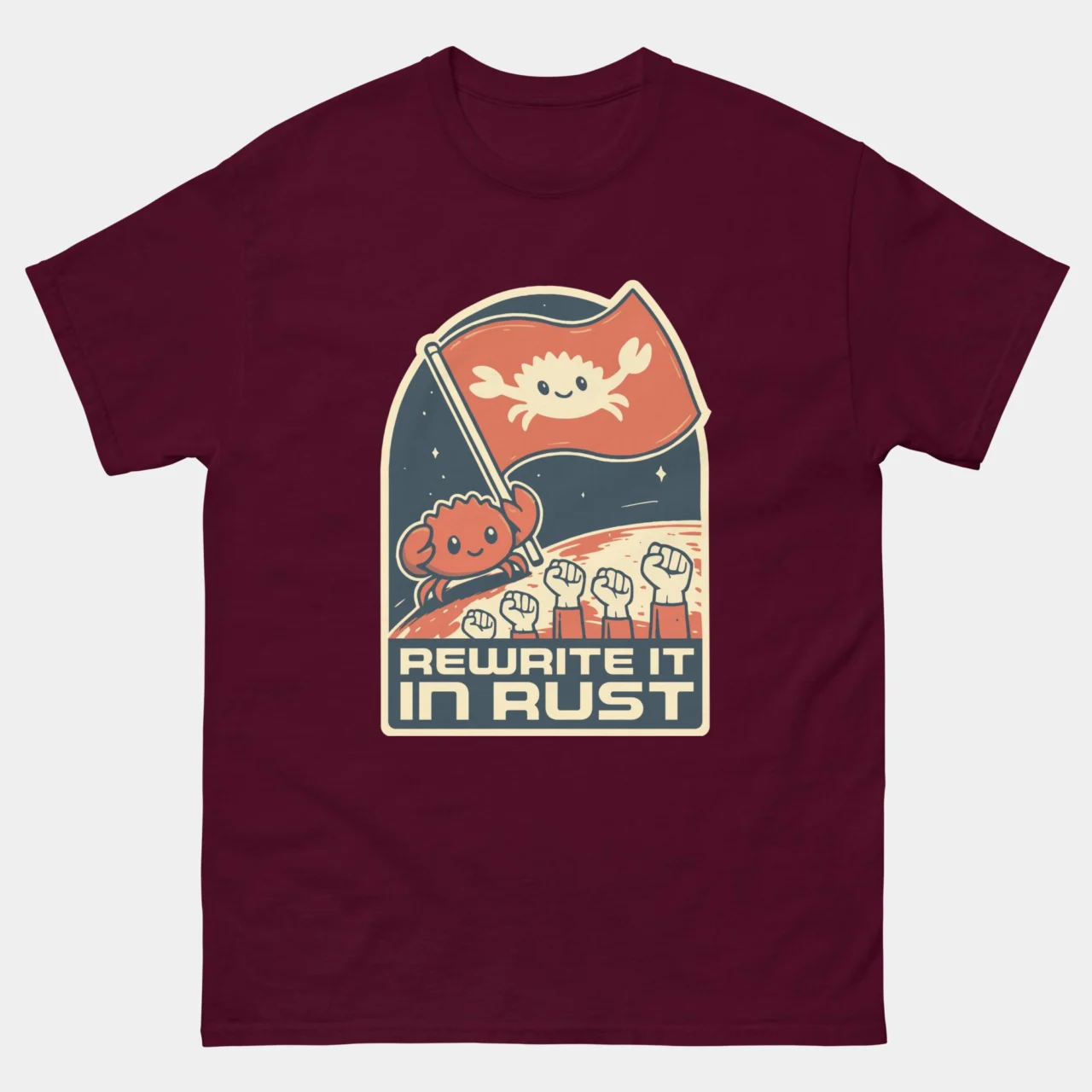This tee is a badge of honor for Rustaceans, systems programmers, and anyone who loves that speedy, memory-safe language with the iconic crab mascot.