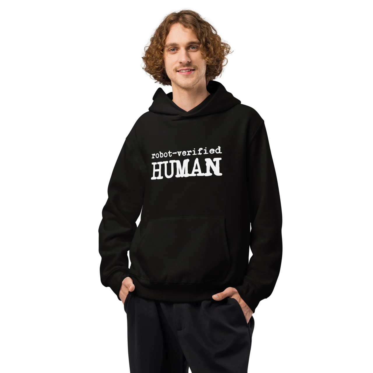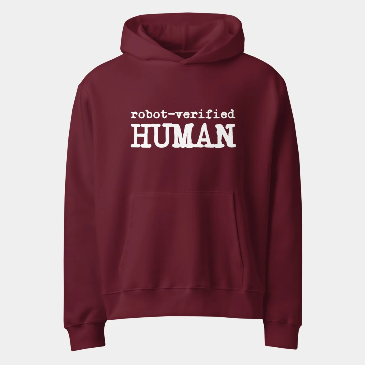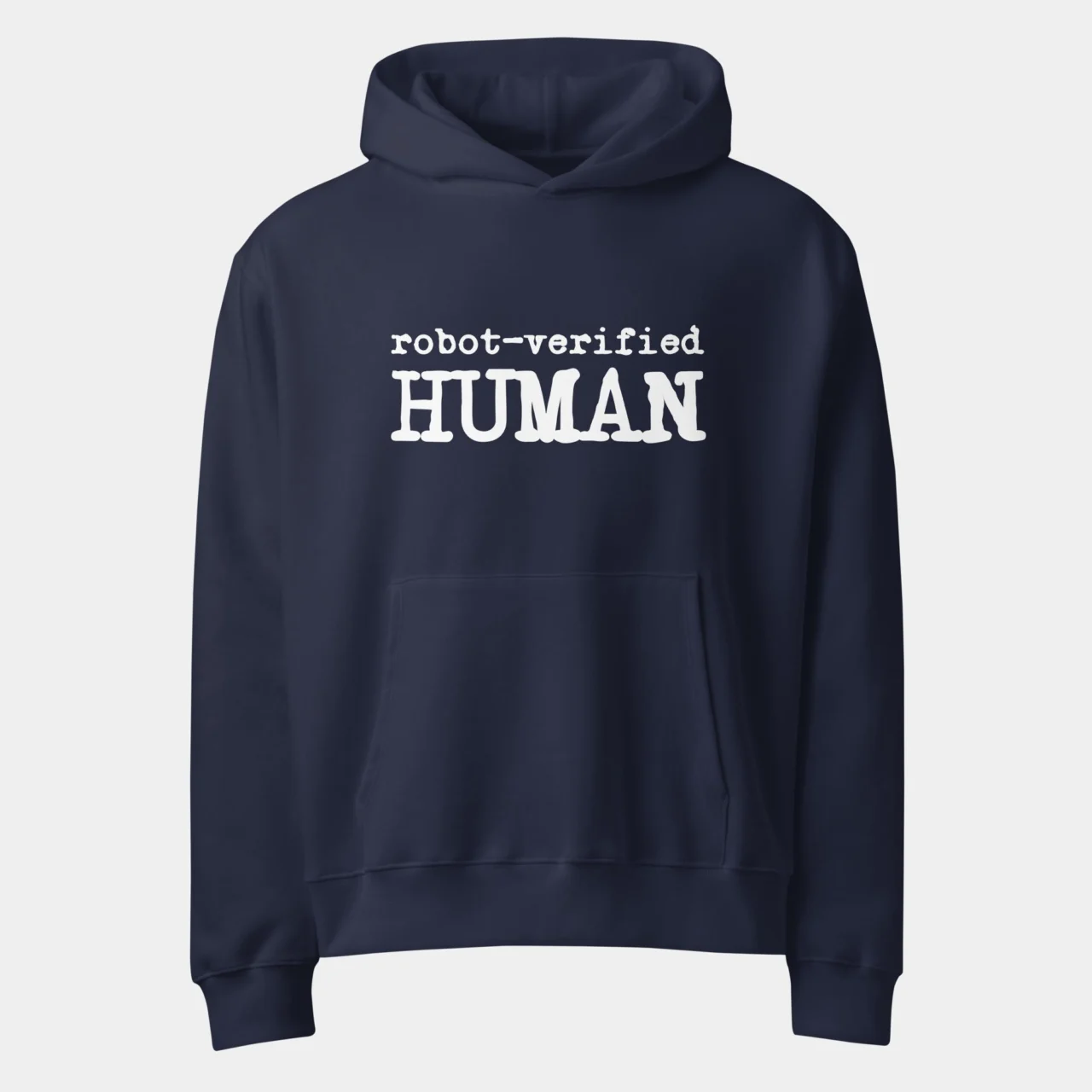 Robot Verified Human Oversized Hoodie – Funny CAPTCHA Humor Pullover – Sci-Fi Fans Artificial Intelligence Gift – Human Verification Co-Worker Top – Heavyweight Fleece