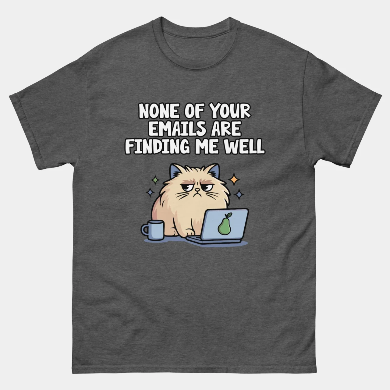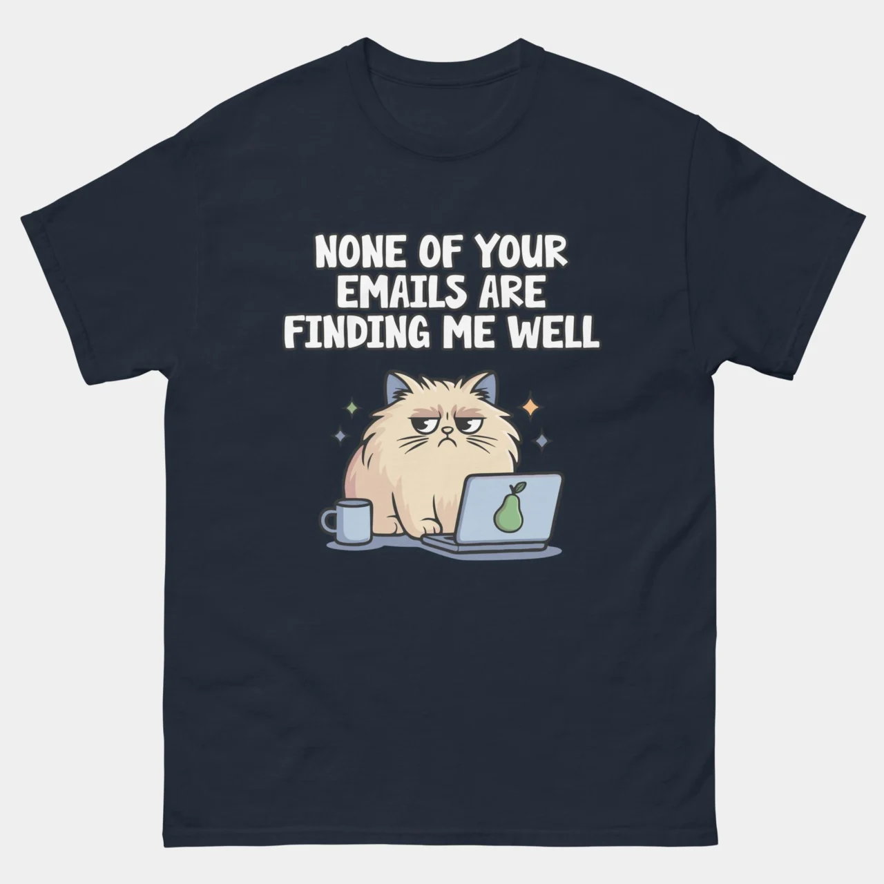 Sarcastic Office Humor Shirt, None of Your Emails Are Finding Me Well Funny Cat T-Shirt, Grumpy Coder Feline Tee, Gift for Overworked Remote Workers