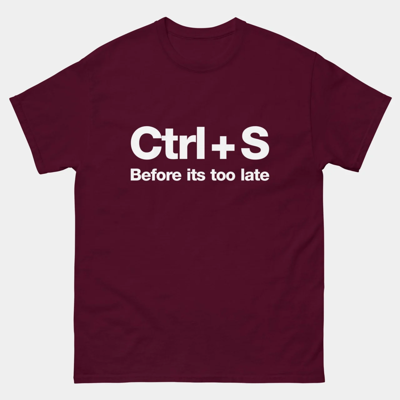 Save Before Its Too Late T-Shirt: Ctrl + S: The most important shortcut in life! Every programmer, designer, and IT pro knows the absolute panic of forgetting to save their work. This funny programmer t-shirt is a hilarious reminder to always save before it’s too late!