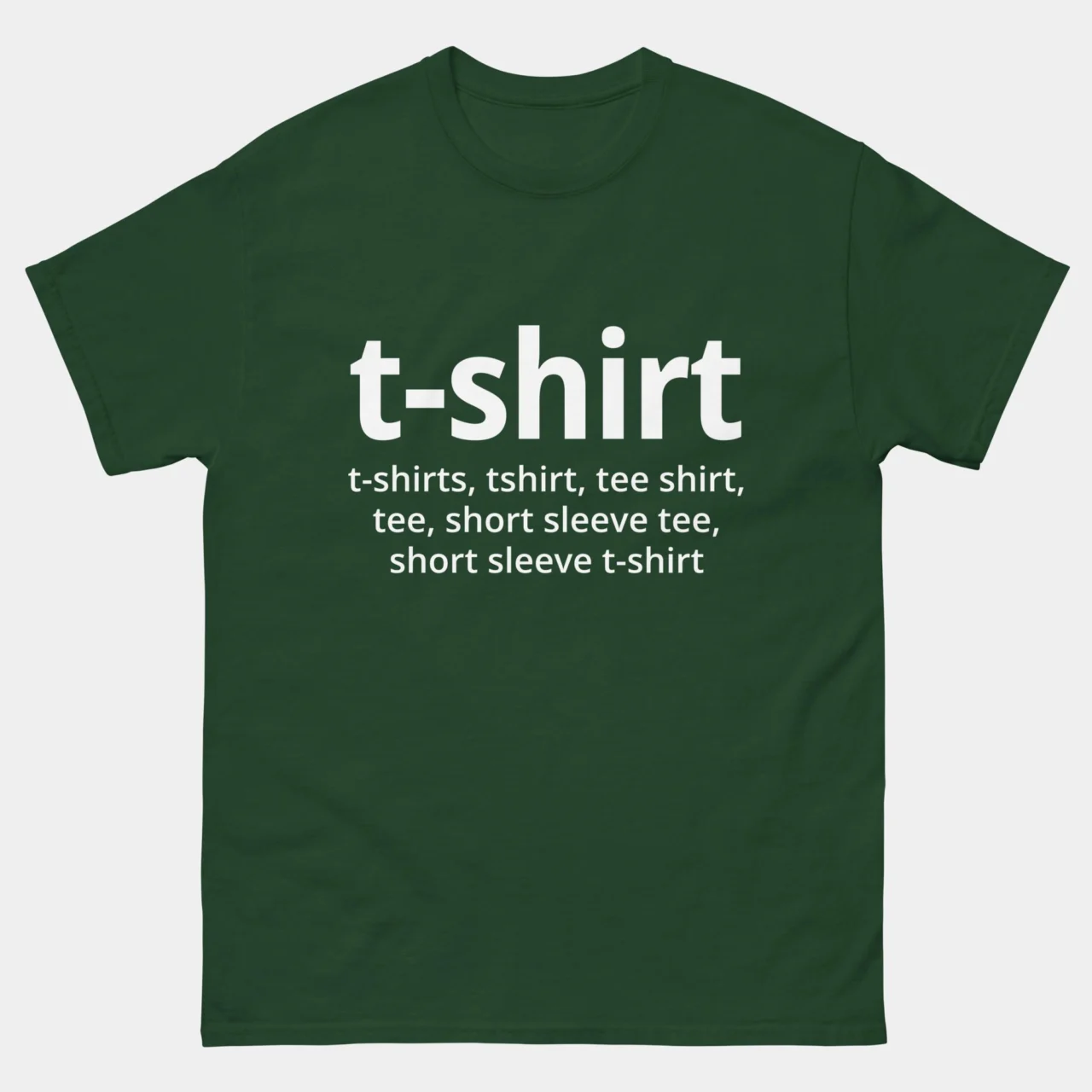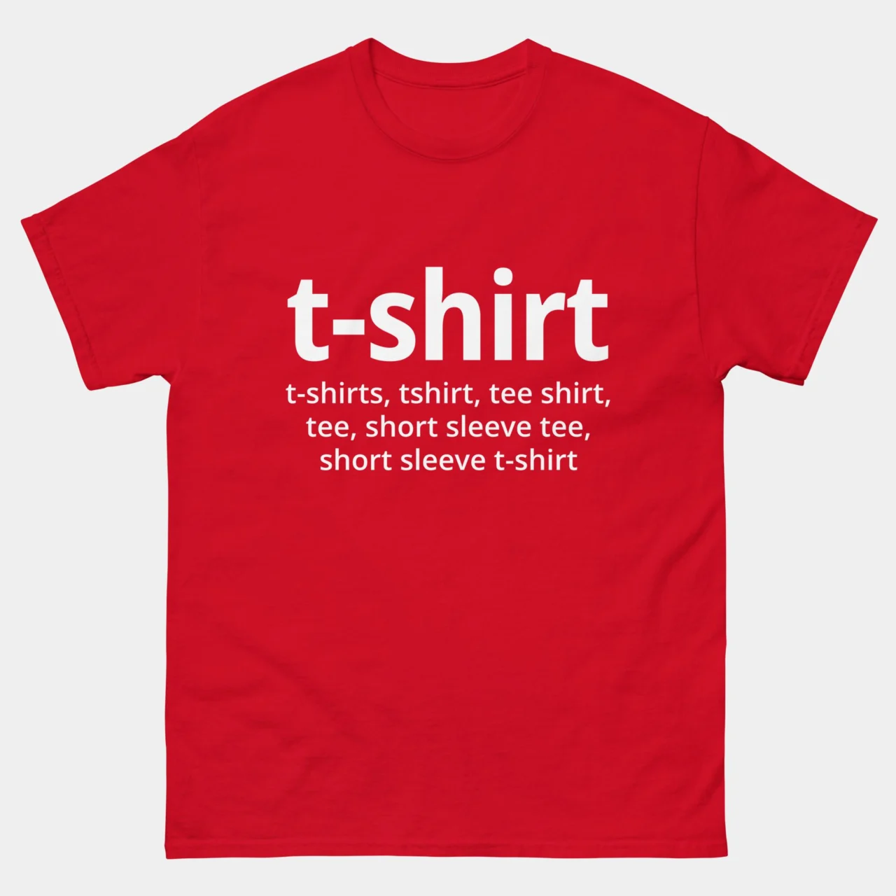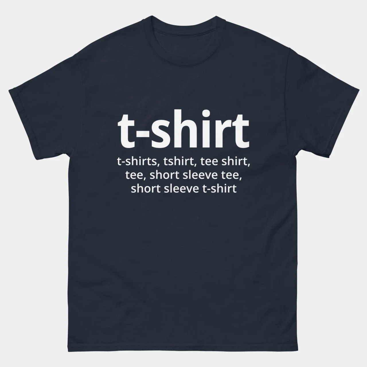 The Ultimate Meta Design: This shirt is designed like a keyword research list, literally optimizing the garment for the very thing it is—a “t-shirt”.