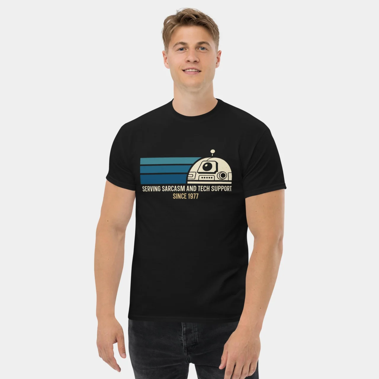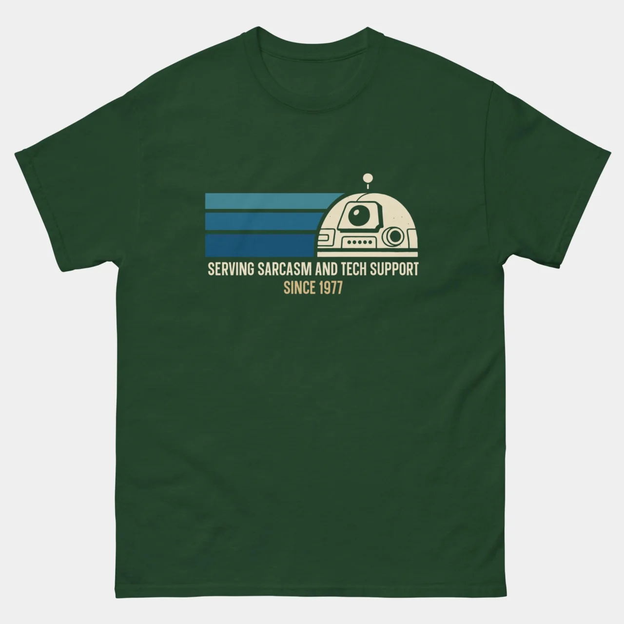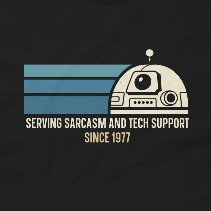 Buy Serving Sarcasm and Tech Support Since 1977 Funny Sci-Fi T-Shirt. A tribute to everyone’s favorite beeping tech wizard. Part sass, part hero, all droid. This tee is perfect for sci-fi lovers, tech geeks, and sarcastic troubleshooters.
