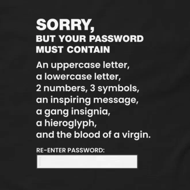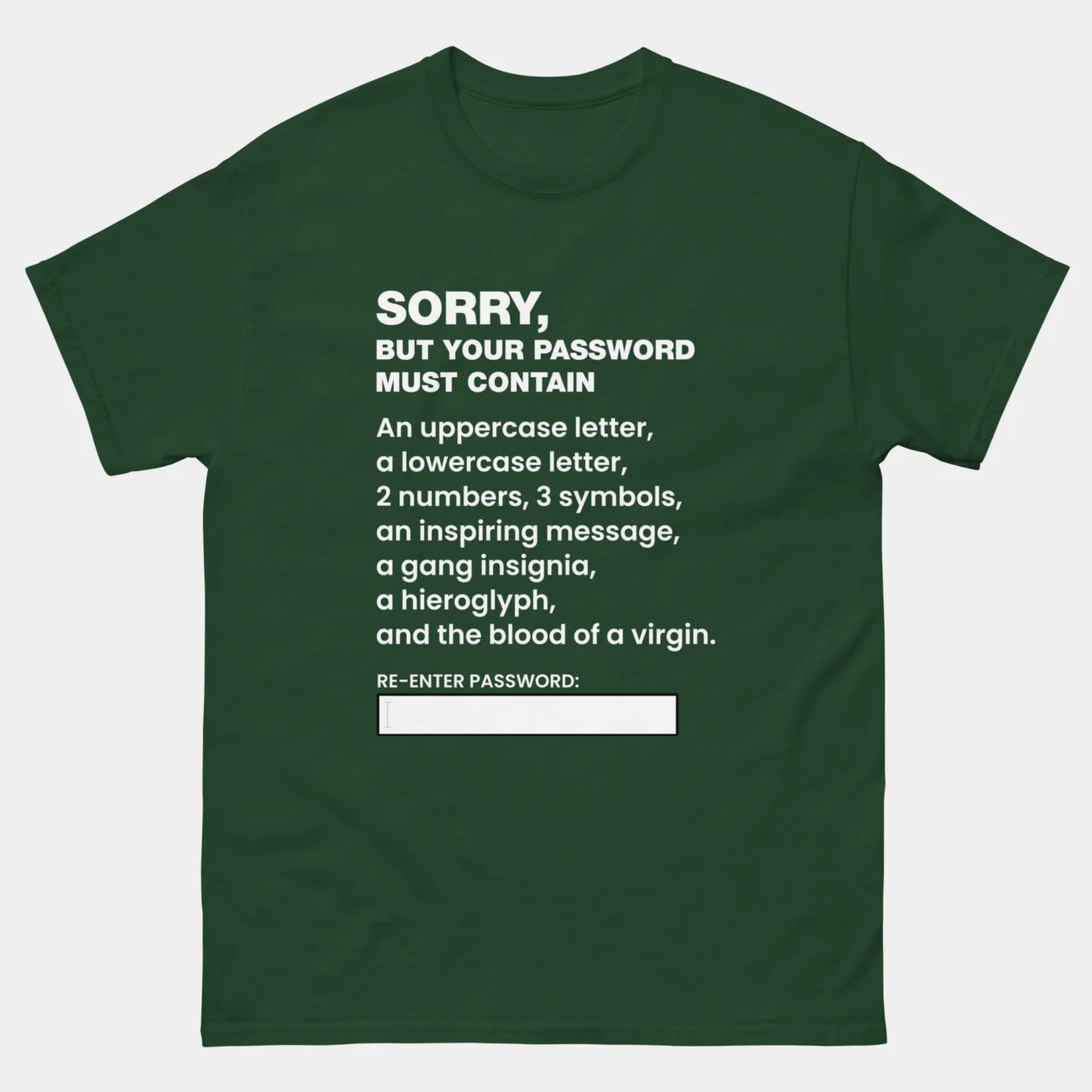 The ultimate struggle for modern internet users! This T-shirt features a satirical, overly-complex list of password requirements, starting with the reasonable: “An uppercase letter, a lowercase letter, 2 numbers, 3 symbols,” and descending into the ridiculous: “an inspiring message, a gang insignia, a hieroglyph, and the blood of a virgin.”