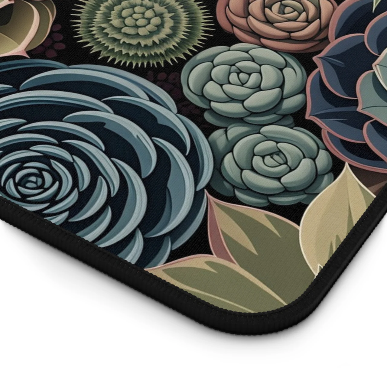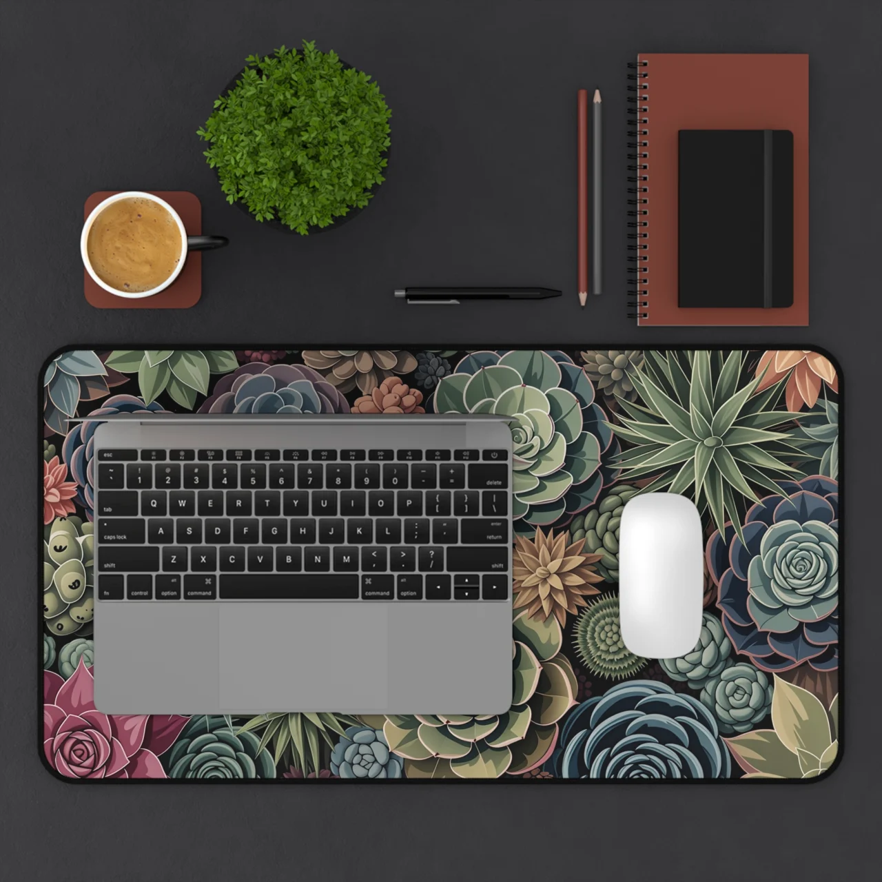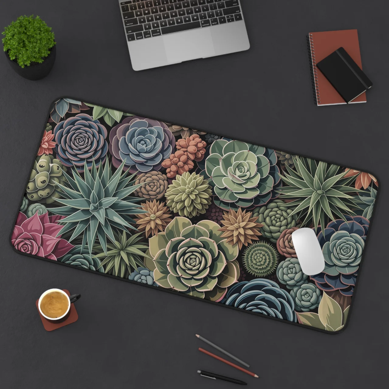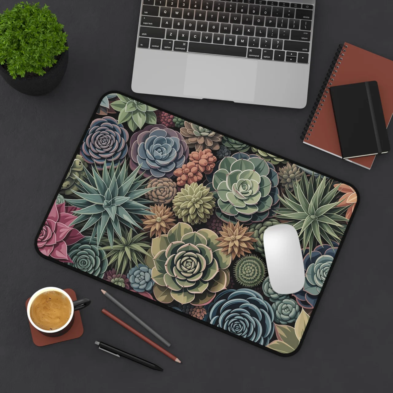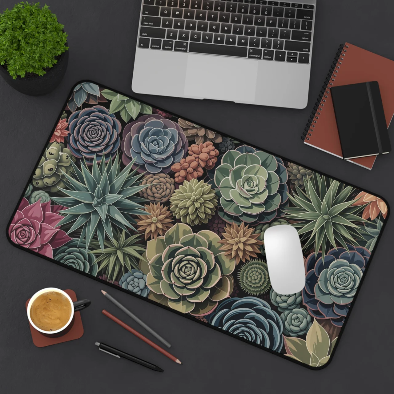 Why settle for a boring desk when you can have a flourishing garden? This desk mat is designed for the “plant parents” and nature enthusiasts who want to surround themselves with organic beauty. The design features a stunning tapestry of succulents in varied shapes and colors, creating a rich, 3D textured effect that pops against any desktop.