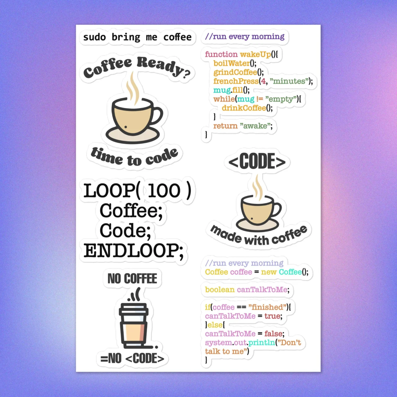 Run your morning script properly. This sticker sheet is a must-have for developers who speak in terminal commands and nested loops. From “sudo” requests to complex “wakeUp()” functions, these decals celebrate the logic behind every great cup of coffee.