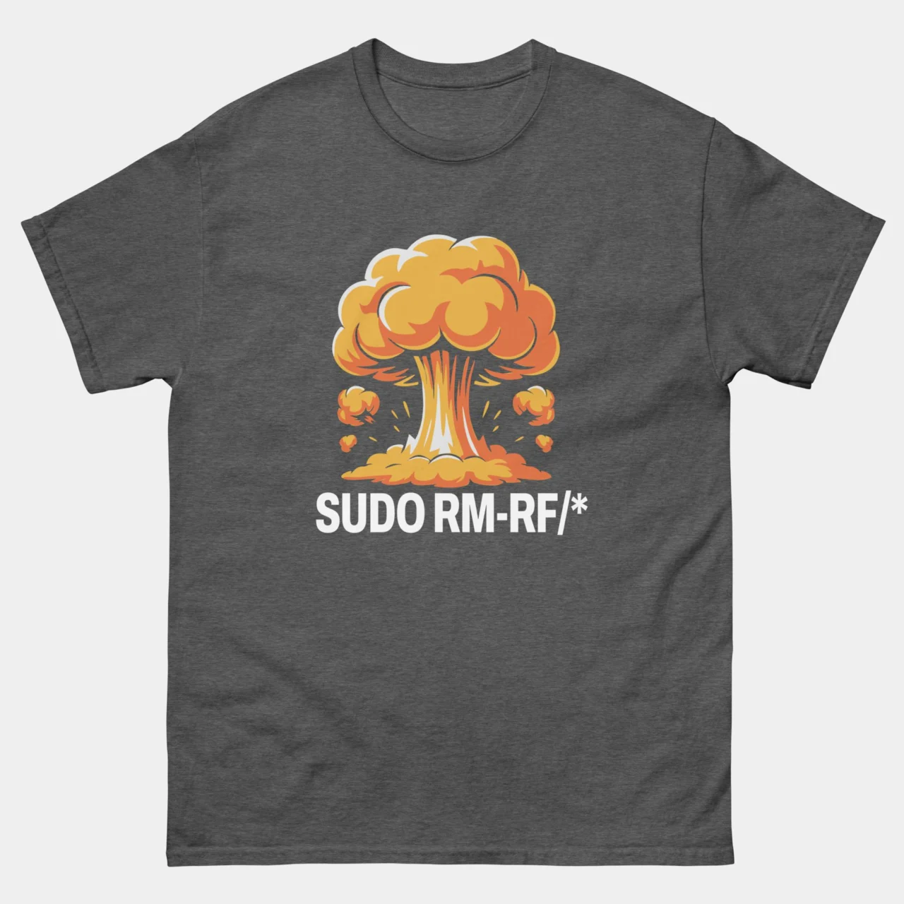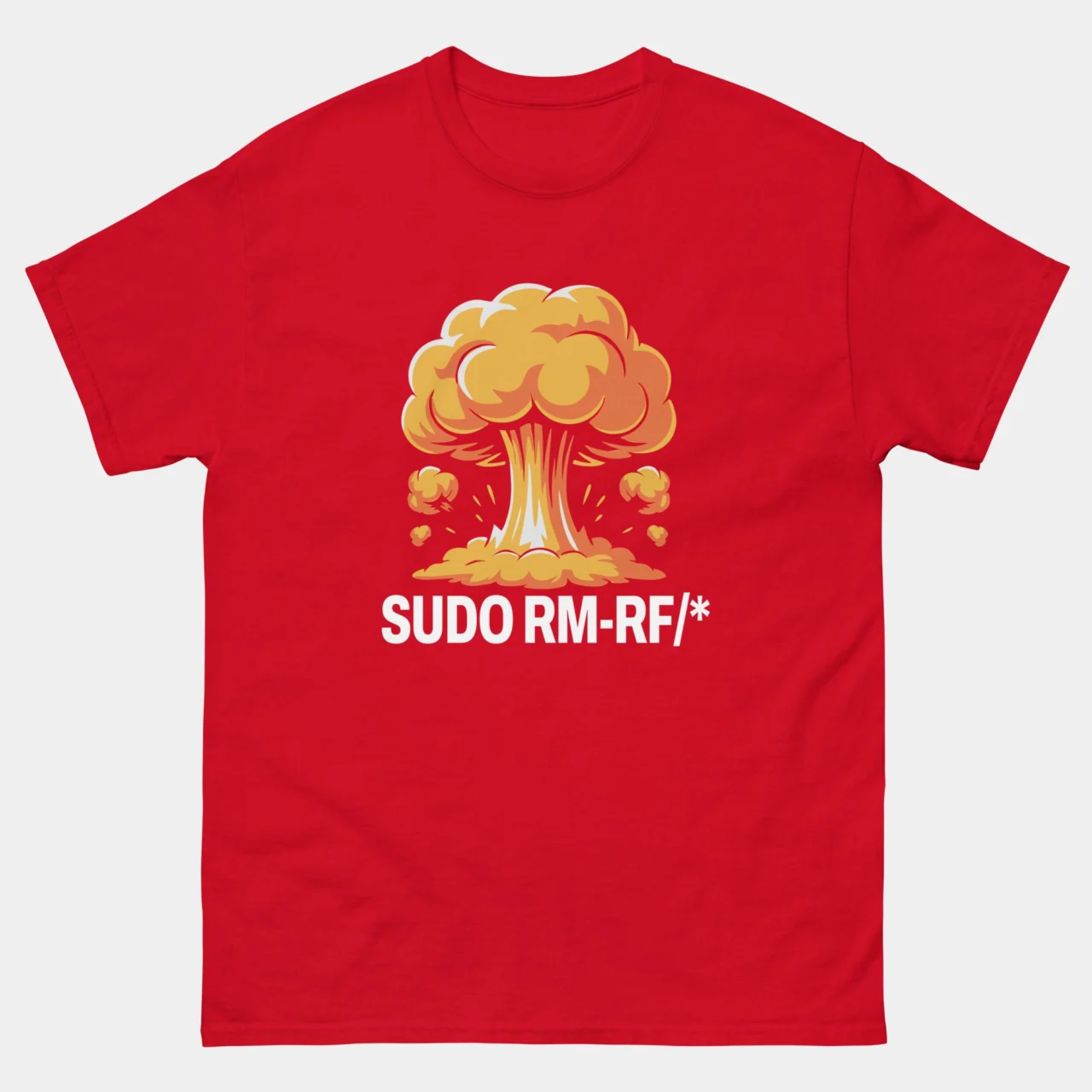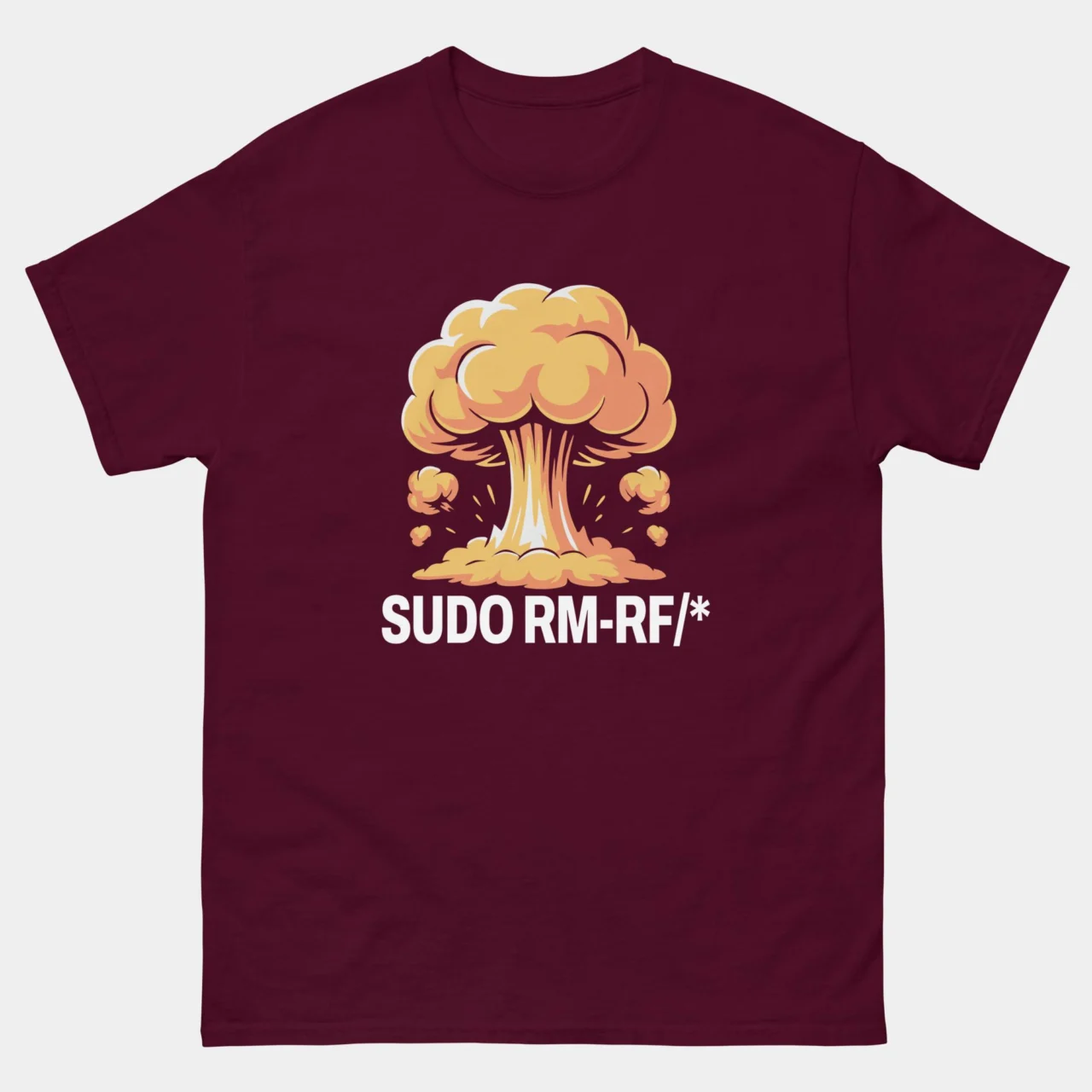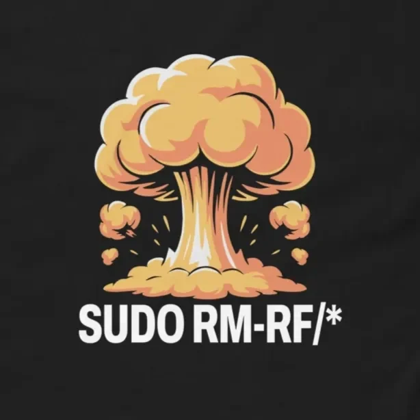 Wear the command that keeps SysAdmins up at night. This striking black Sudo RM-RF Funny Linux T-shirt features a detailed, vibrant mushroom cloud explosion in shades of yellow and orange, looming over the ultimate “delete everything” command: