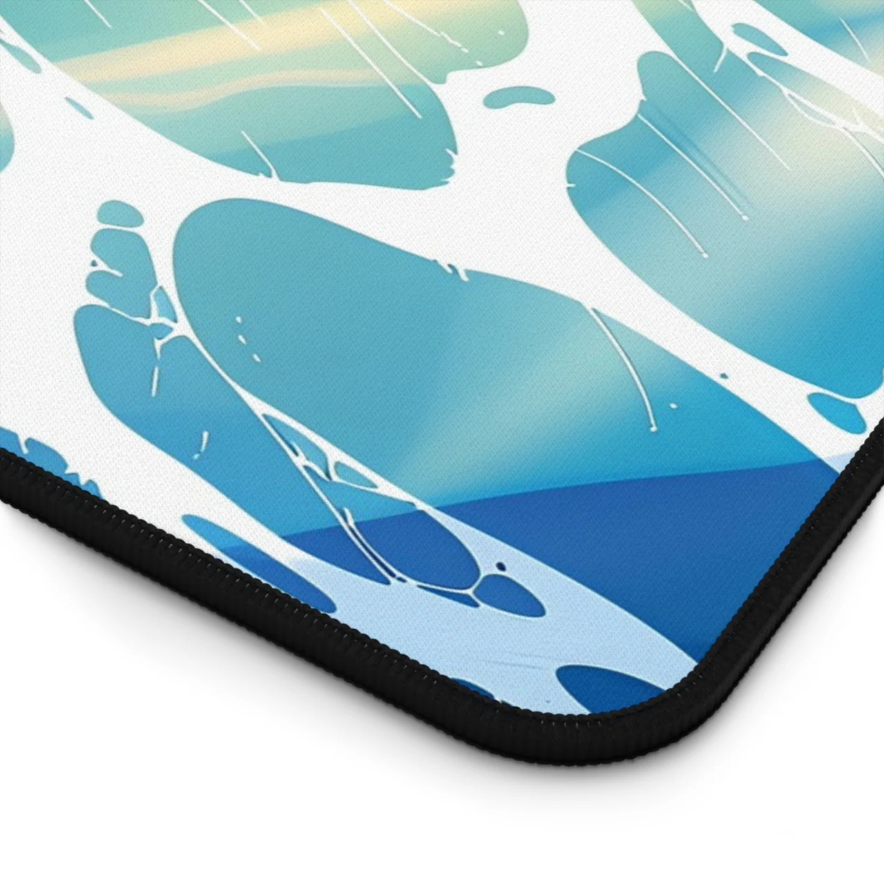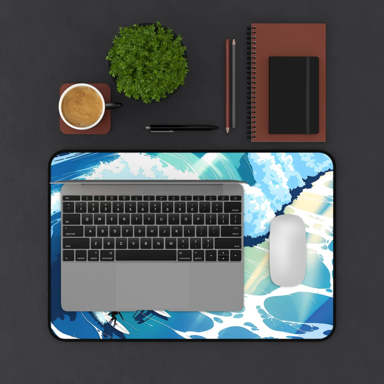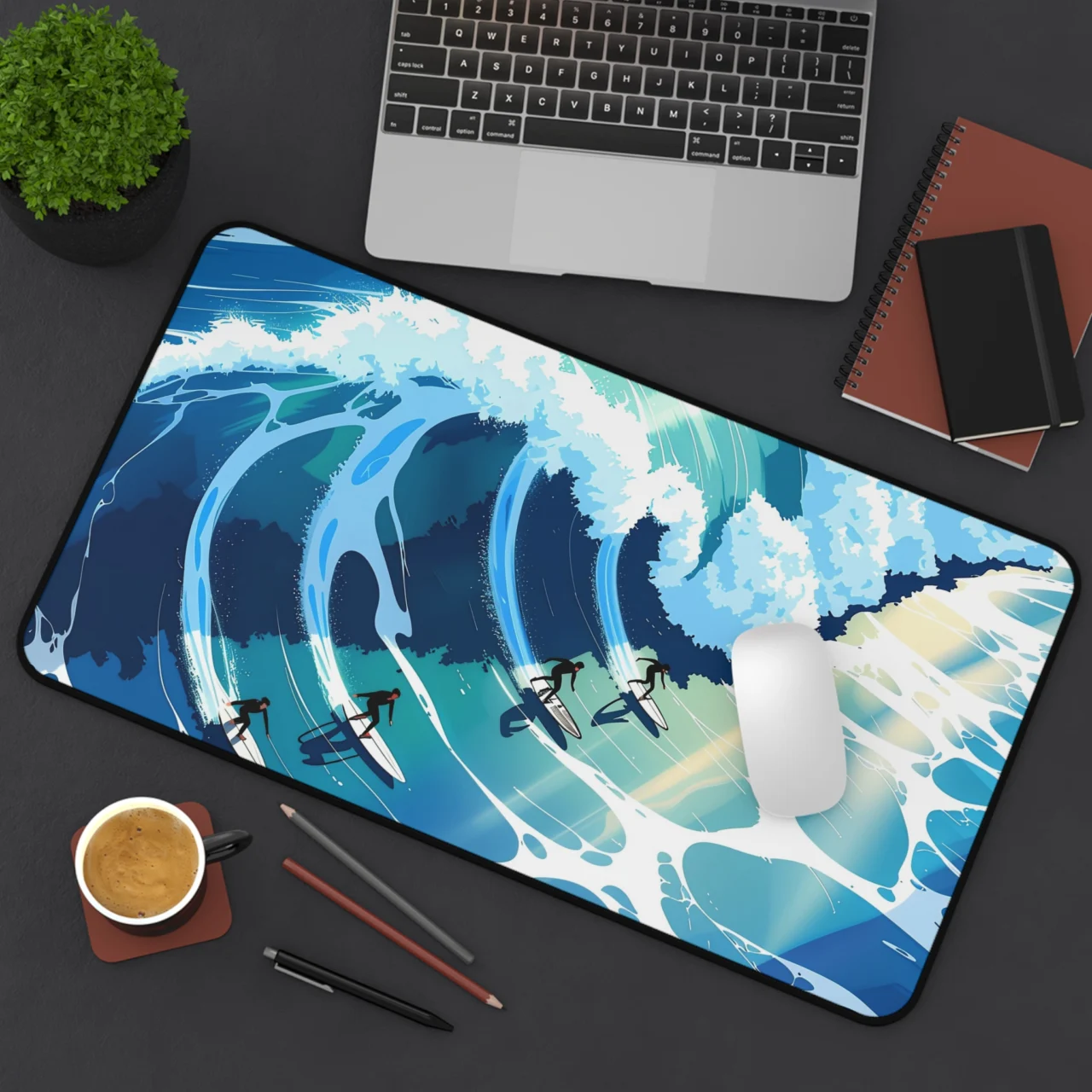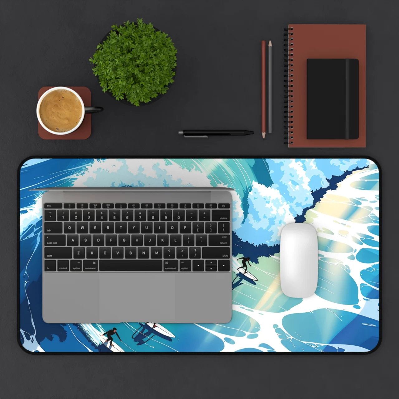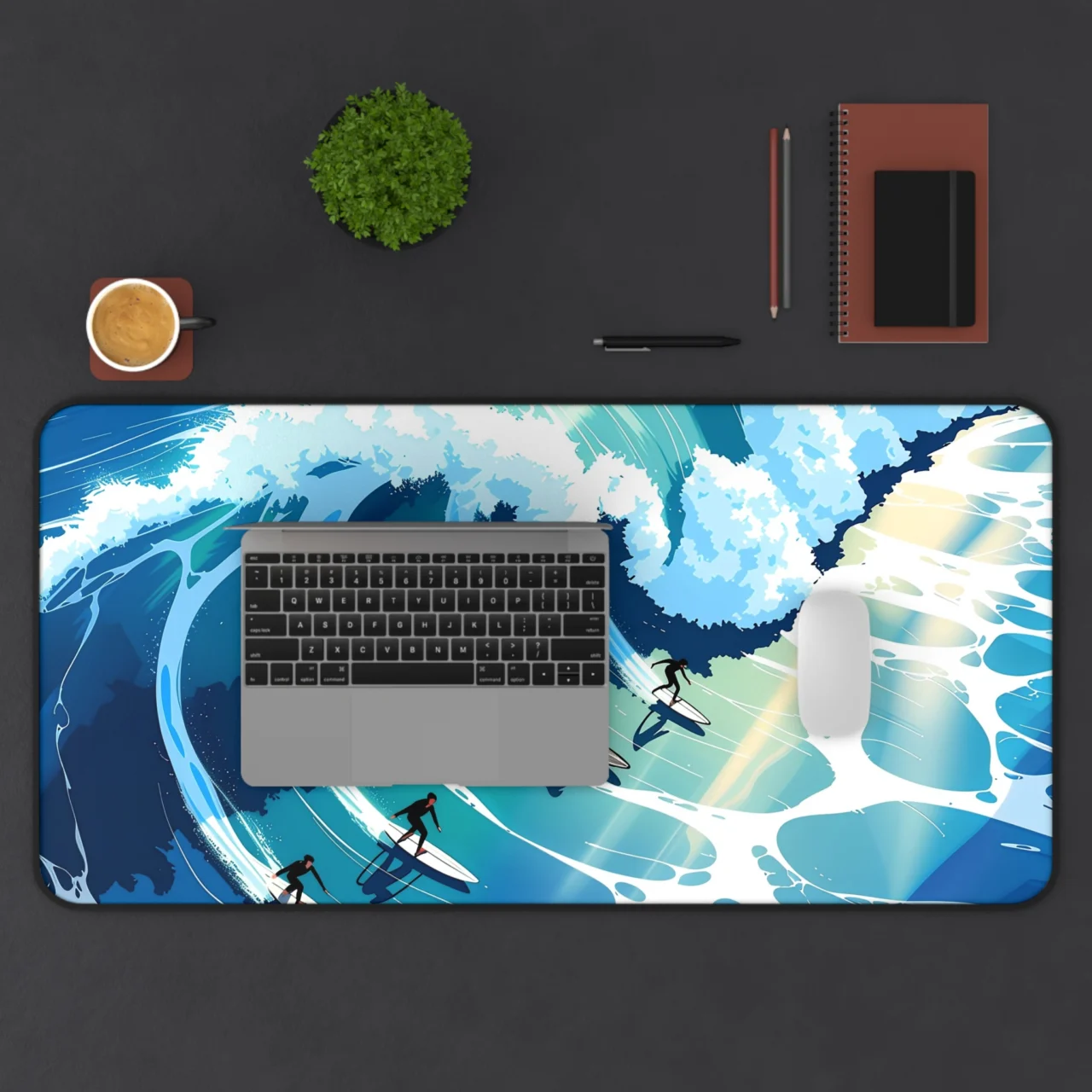Whether you’re a literal surfer or just someone who dreams of the sea, this desk mat is all about that “surf’s up” energy. The design uses a bold, illustrative style to depict surfers carving through massive, stylized blue waves. It’s clean, it’s bright, and best of all, there’s no sand in your keyboard.