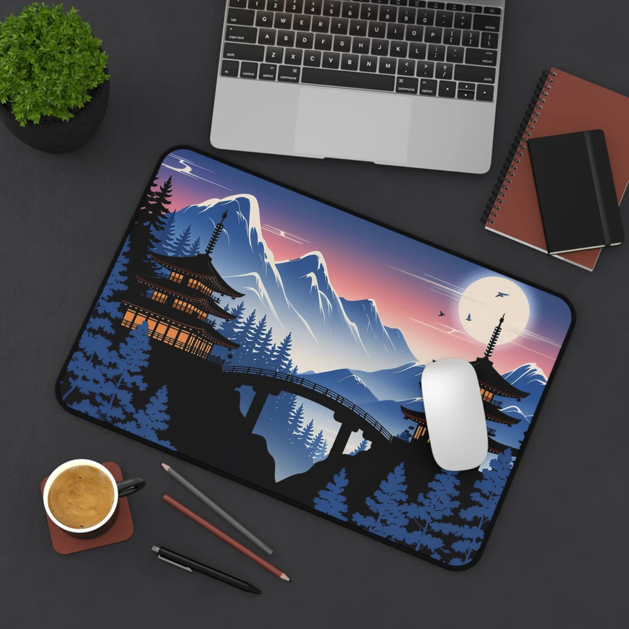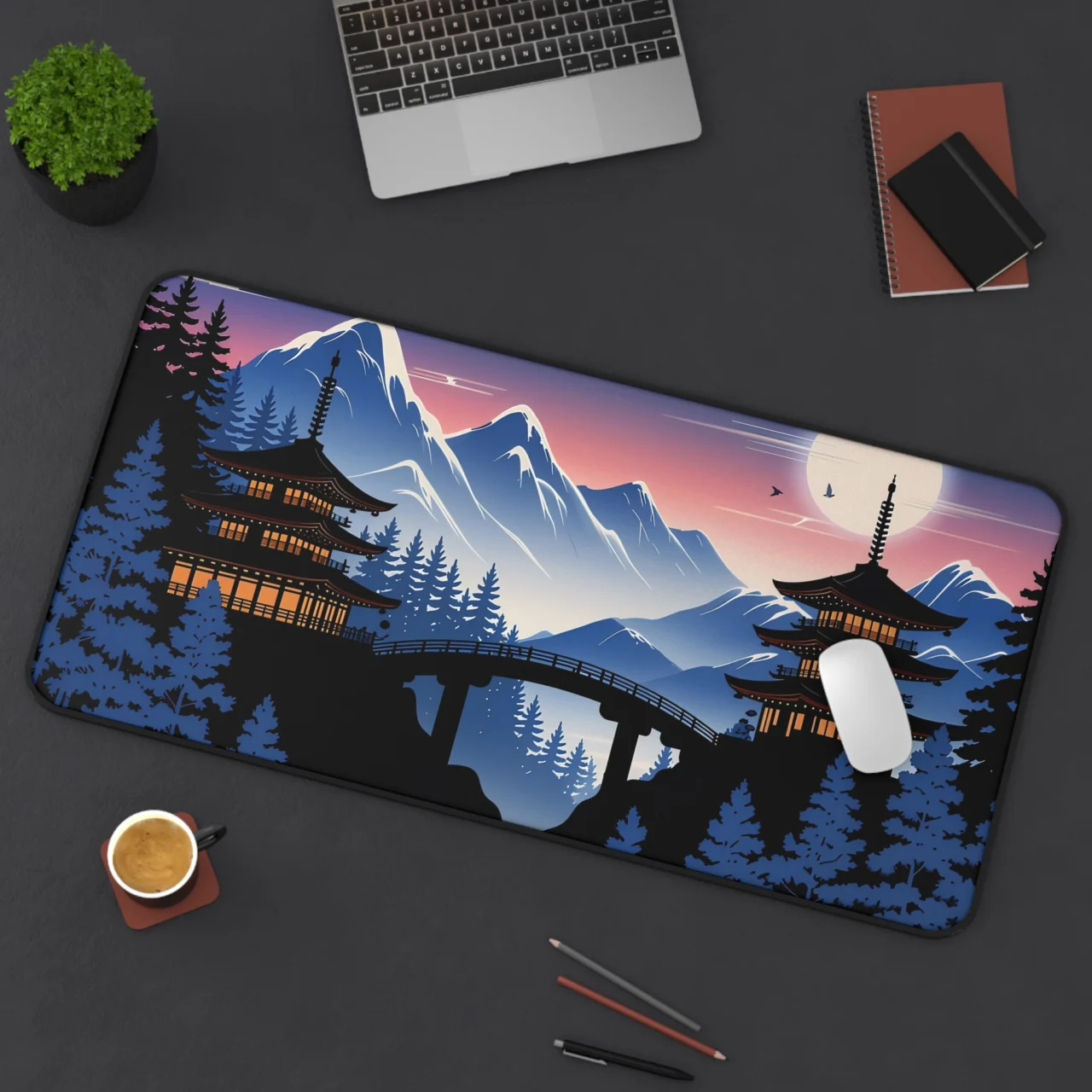 This isn’t just a mat; it’s a direct transmission from a retrowave paradise. Featuring a gorgeous, high-contrast illustration of traditional Japanese pagodas and a bridge silhouetted against sharp, snow-capped mountains. The magic is in the colors: deep blacks and blues contrast sharply with vibrant neon pinks, oranges, and purples of a synthwave sunset (or is that a moonrise?). This mat perfectly captures the moody, nostalgic energy of vaporwave and synthwave art.