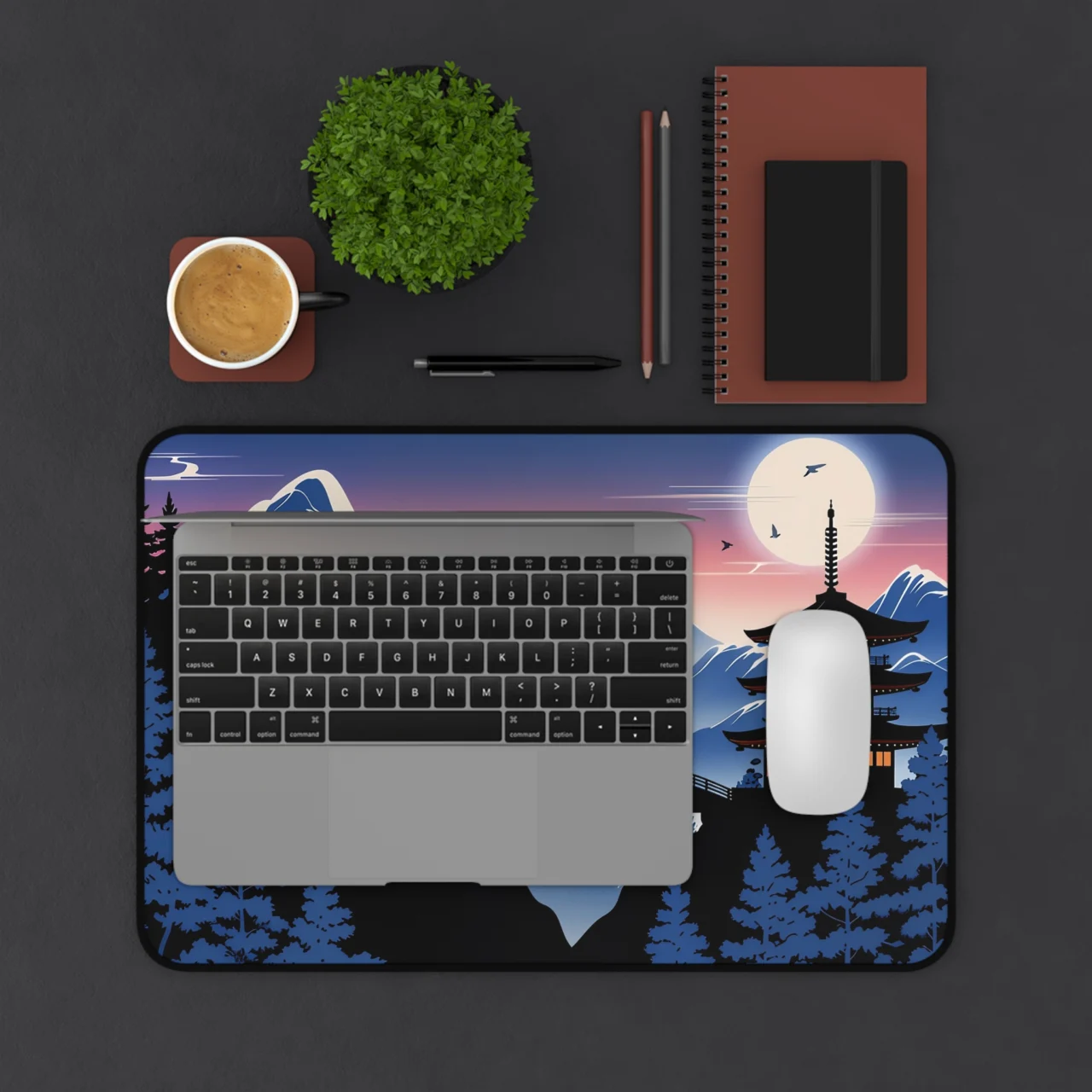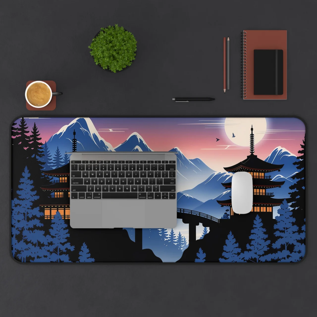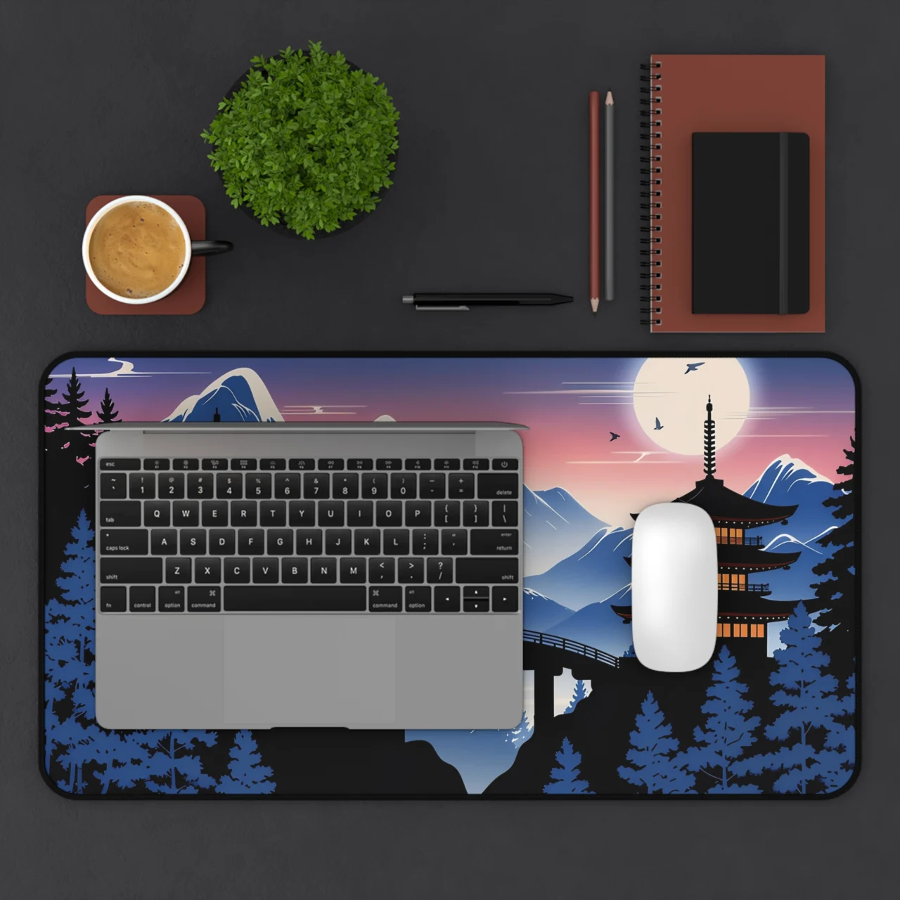 Synthwave Japanese Landscape Desk Mat – Pagoda Mountain XL Keyboard Mat – Retrowave Gaming Mousepad –Â Neon Sunset Aesthetic – Tech Geek Gift