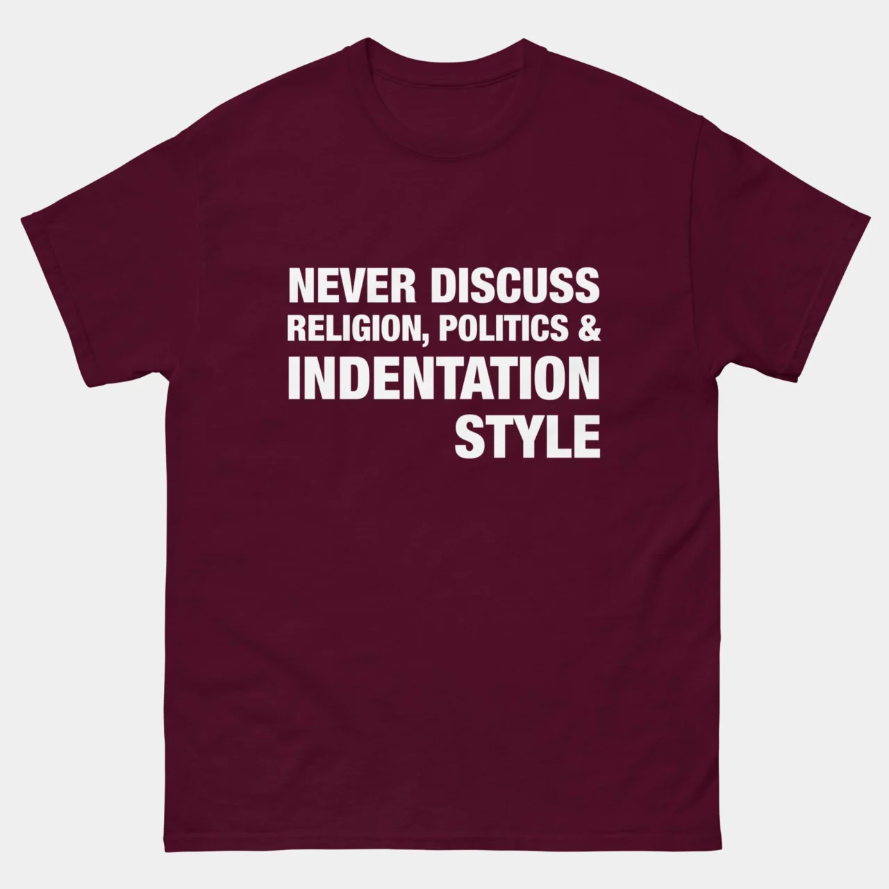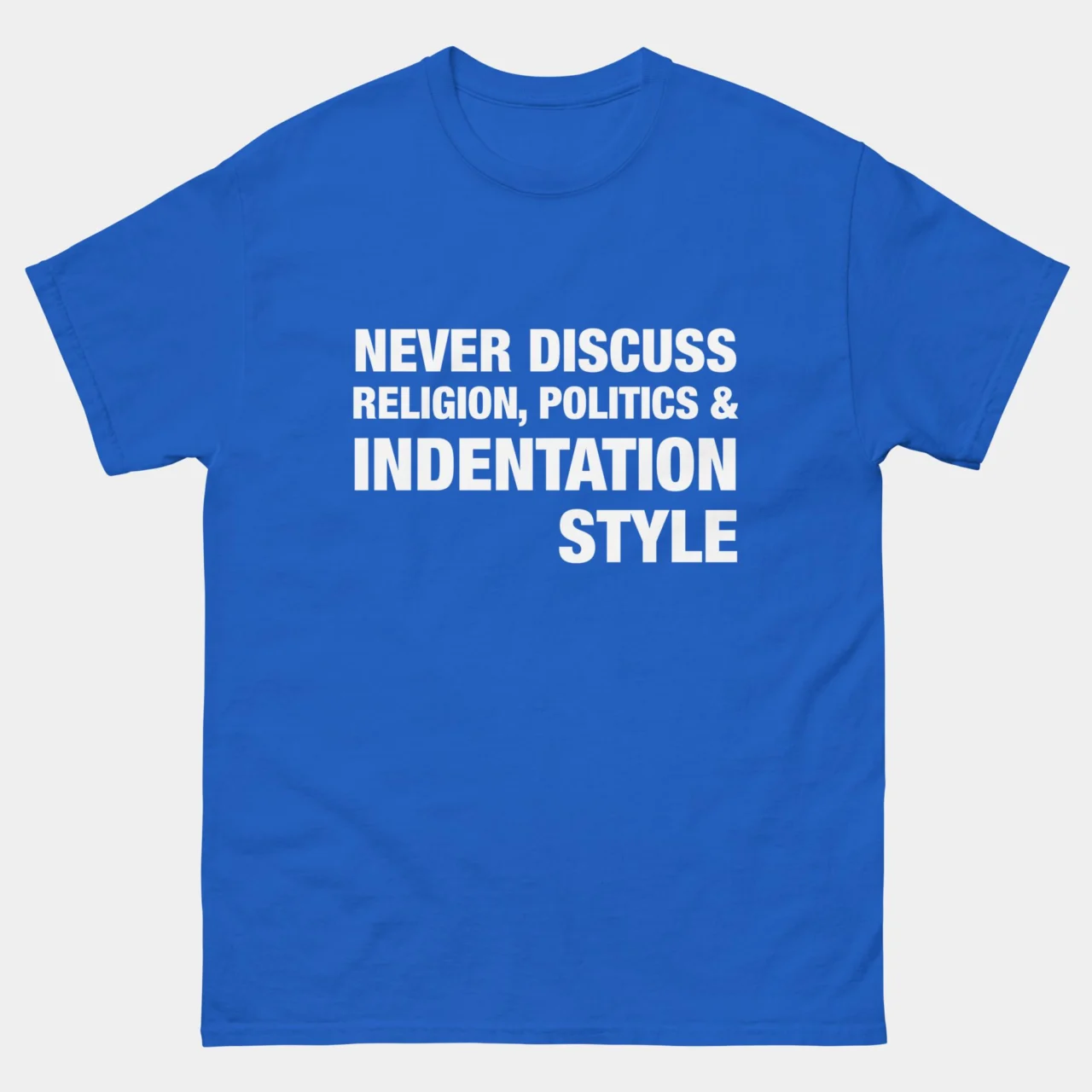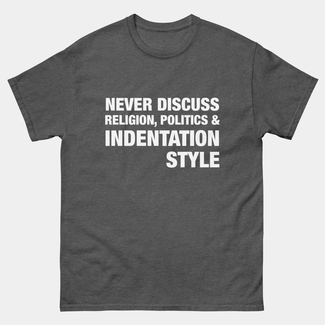 Tabs vs Spaces T-Shirt – Never Discuss Religion Politics and Indentation Style – Funny Programmer Shirt – Software Developer Gift – Classic Unisex Heavy Cotton T-Shirt by TechGeeksApparel:
