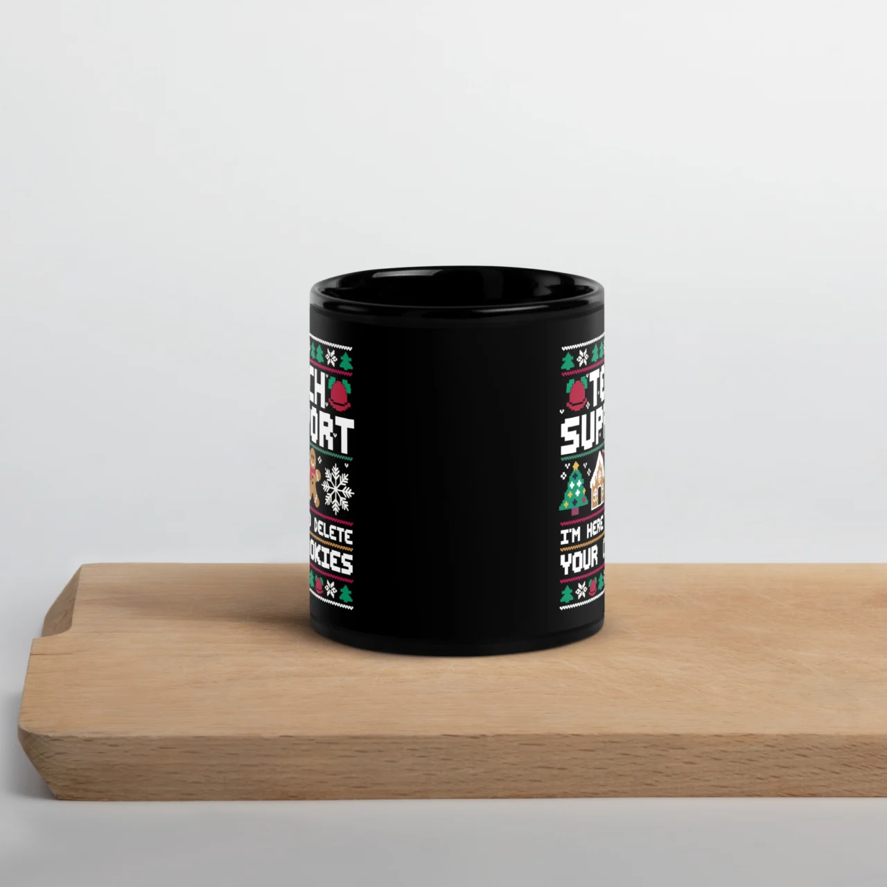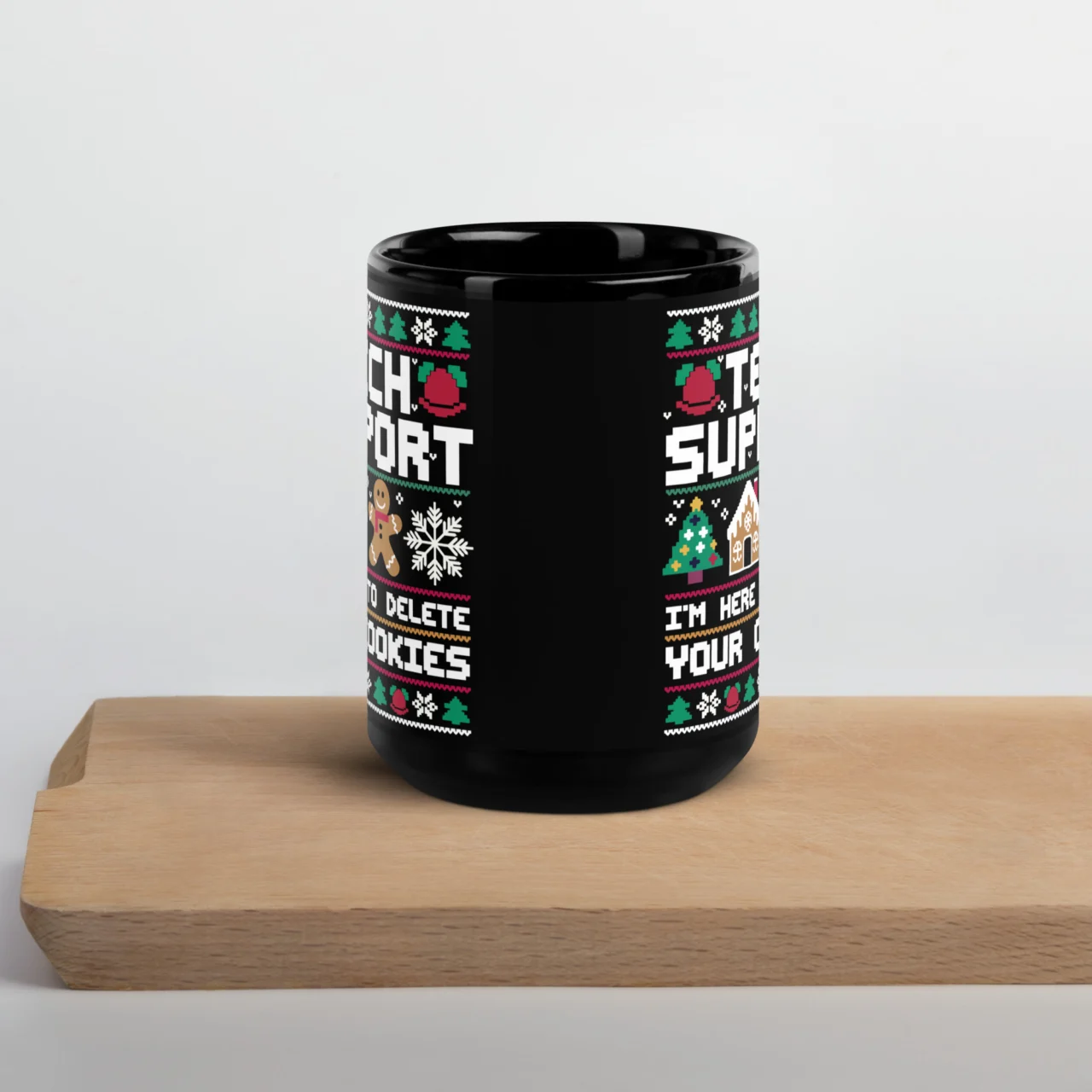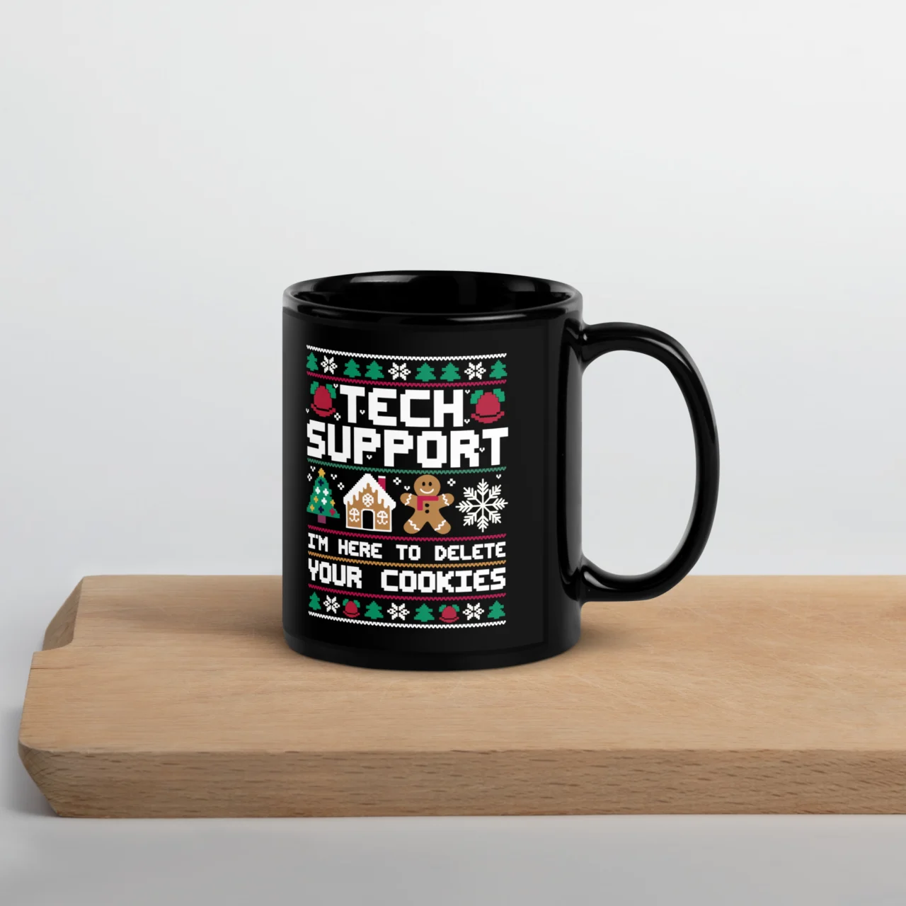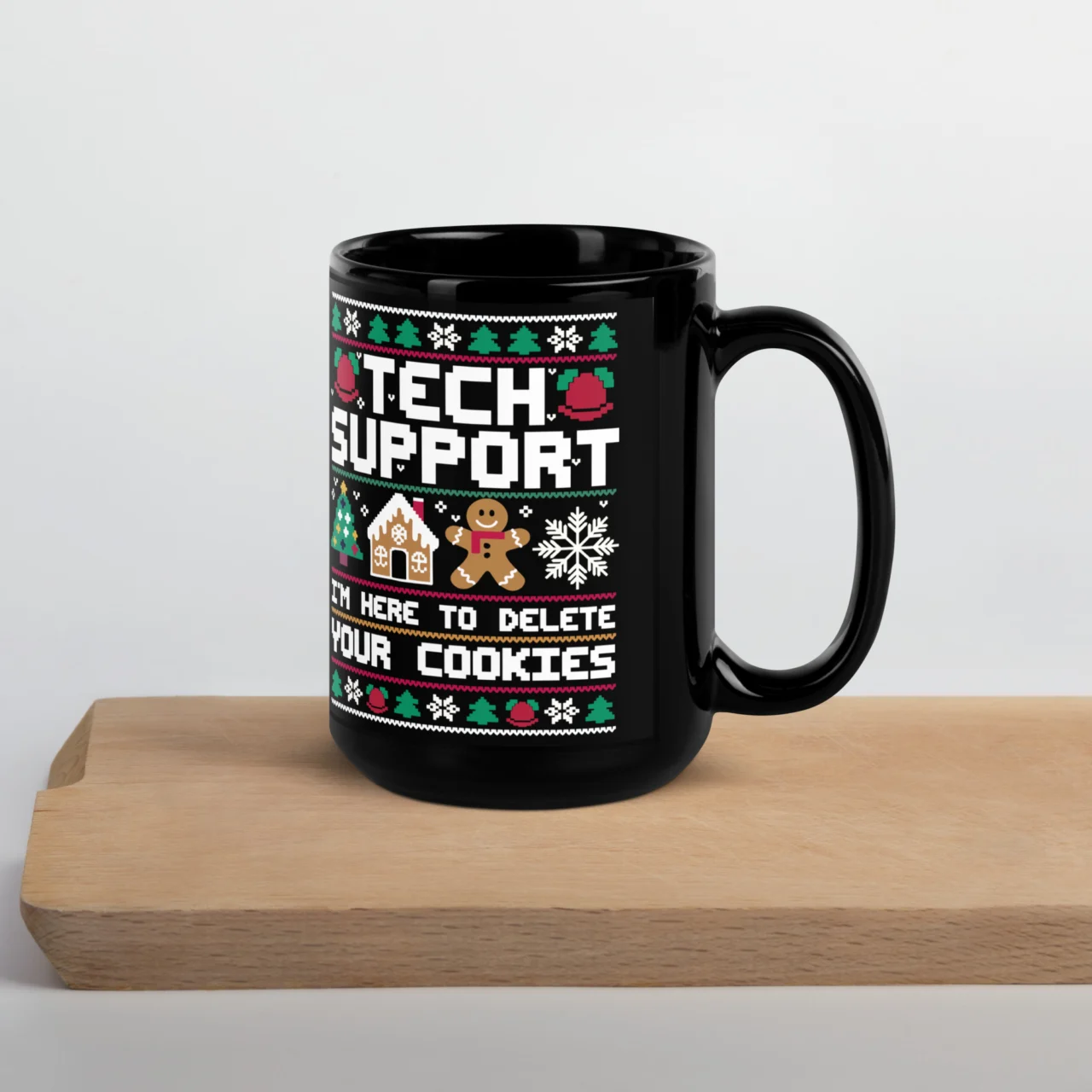 The one person who can actually grant your Christmas wish: the Tech Support hero! This black ceramic mug features a festive “Ugly Christmas Sweater” pattern surrounding the hilarious statement: “TECH SUPPORT I’M HERE TO DELETE YOUR COOKIES“.