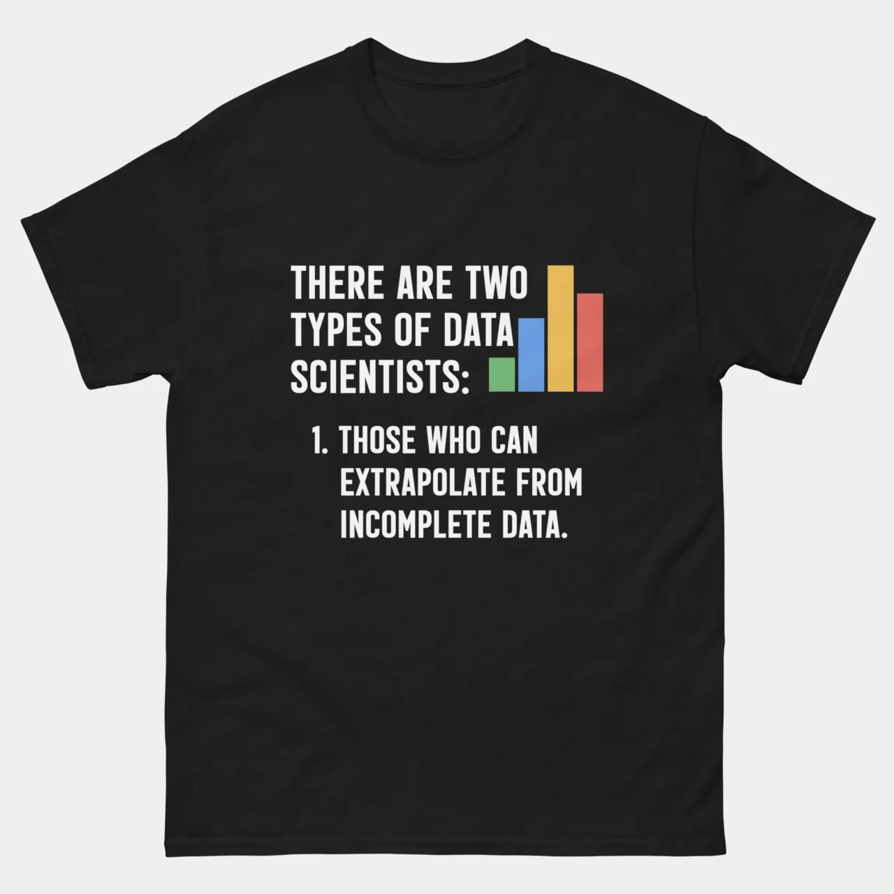 Buy There Are Two Types of Data Scientist T-Shirt: those who can extrapolate from incomplete data… And that’s it. If you got the joke, this t-shirt is for you!