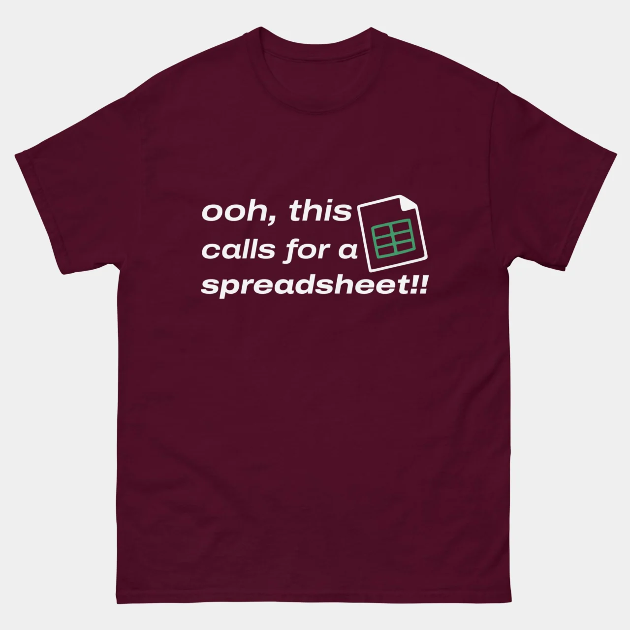 For the person who solves every life dilemma with a pivot table. This classic black This Calls For A Spreadsheet T-Shirt features the enthusiastic rallying cry of every data-driven professional: