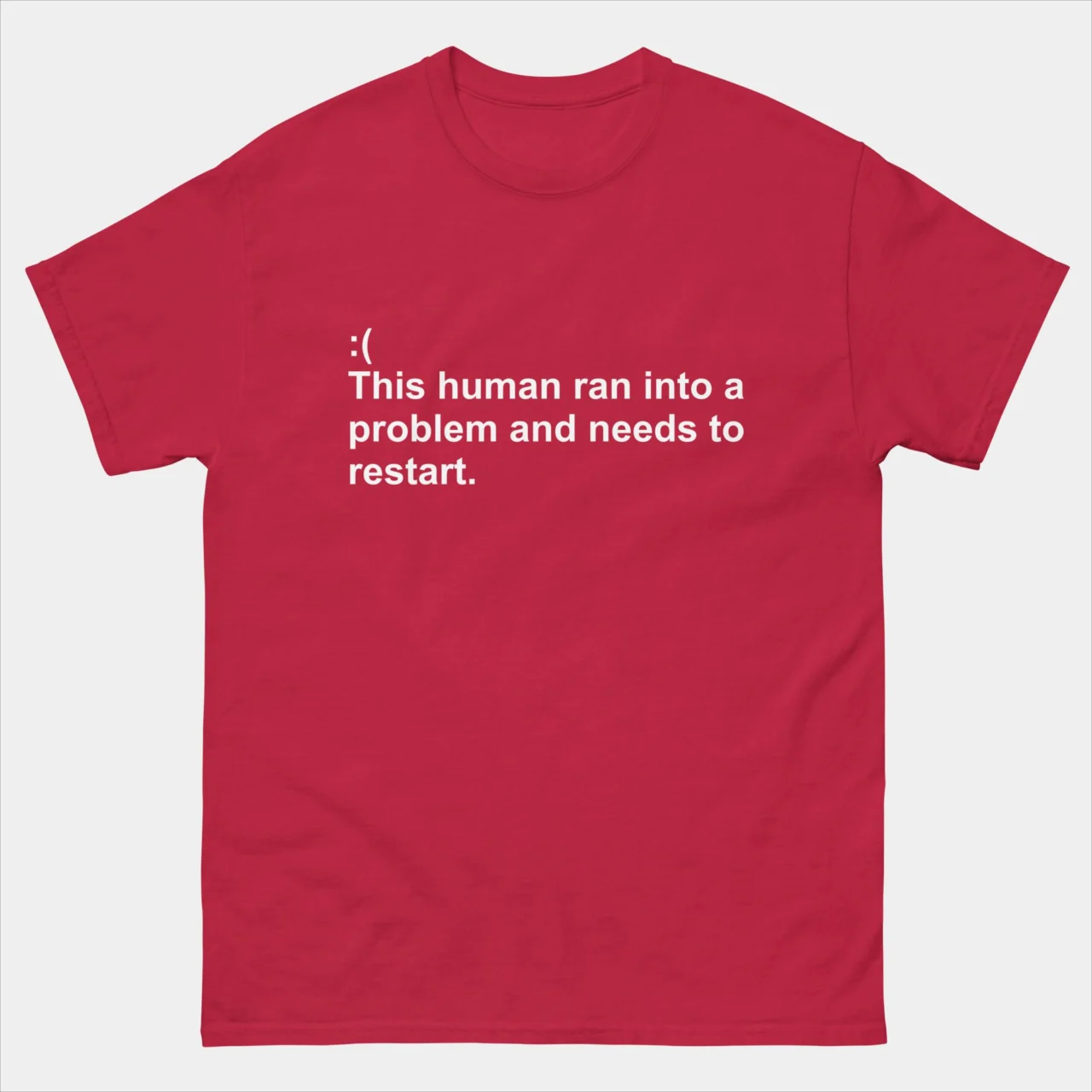 Embrace tech humor with our This Human Ran Into a Problem and Needs to Reset T-Shirt! This funny tee is perfect for stressed computer users who have encountered the notorious Blue Screen of Death in real life. With a playful design, it captures the frustration and humor of technical issues. Made for comfort, this t-shirt is ideal for tech enthusiasts and programmers. Whether you’re attending tech conferences, working on projects, or simply want to showcase your tech humor, this tee is a must-have addition to your collection. Embrace the funny side of computer mishaps with this trendy and lighthearted t-shirt!