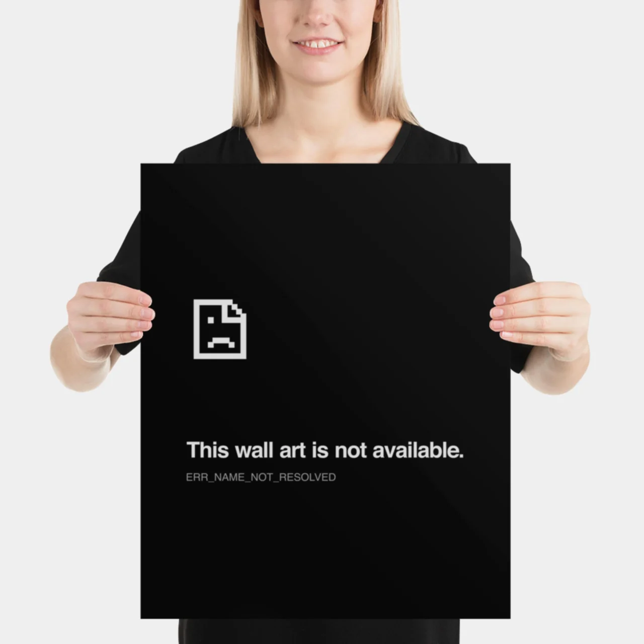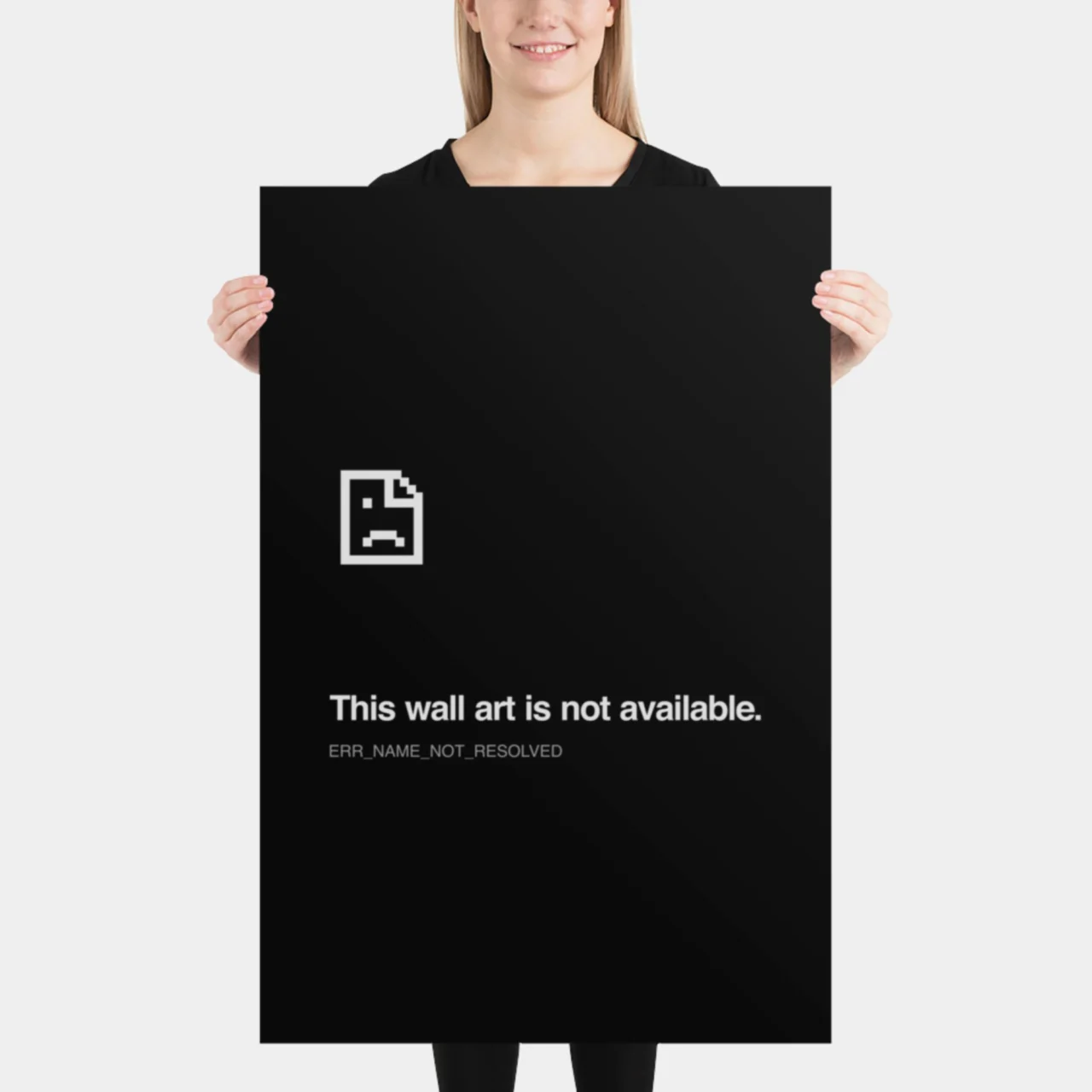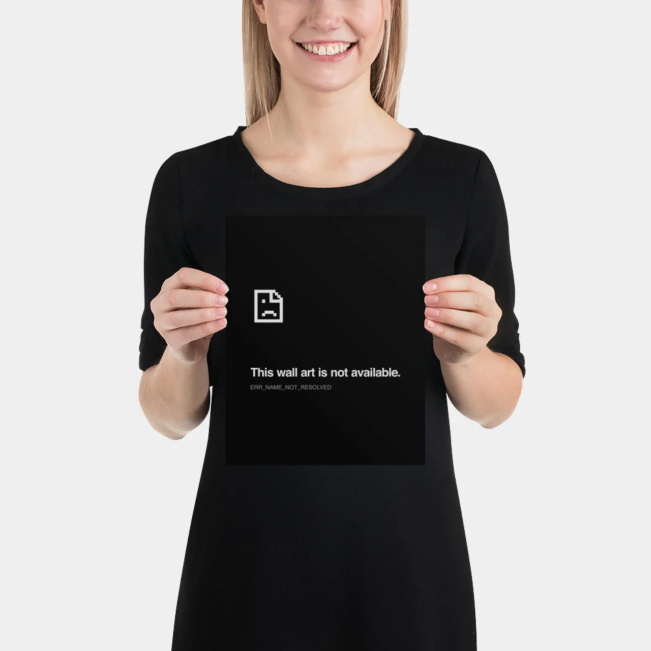 This “This Wall It Was Not Available” Poster uses classic error messages like “err_name_not_resolved” and “not found” to create a funny, clever piece of 404 Error Art. It’s the ultimate piece of Retro Tech humor and Minimal Wall Art for any developer, IT worker, or tech enthusiast.