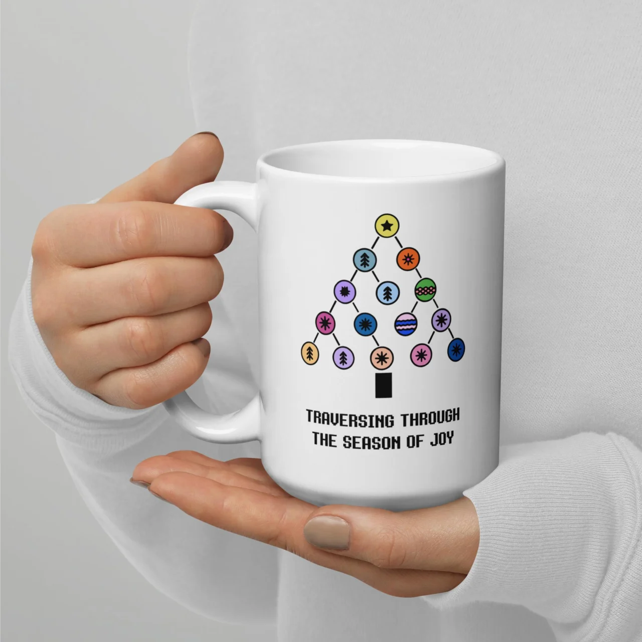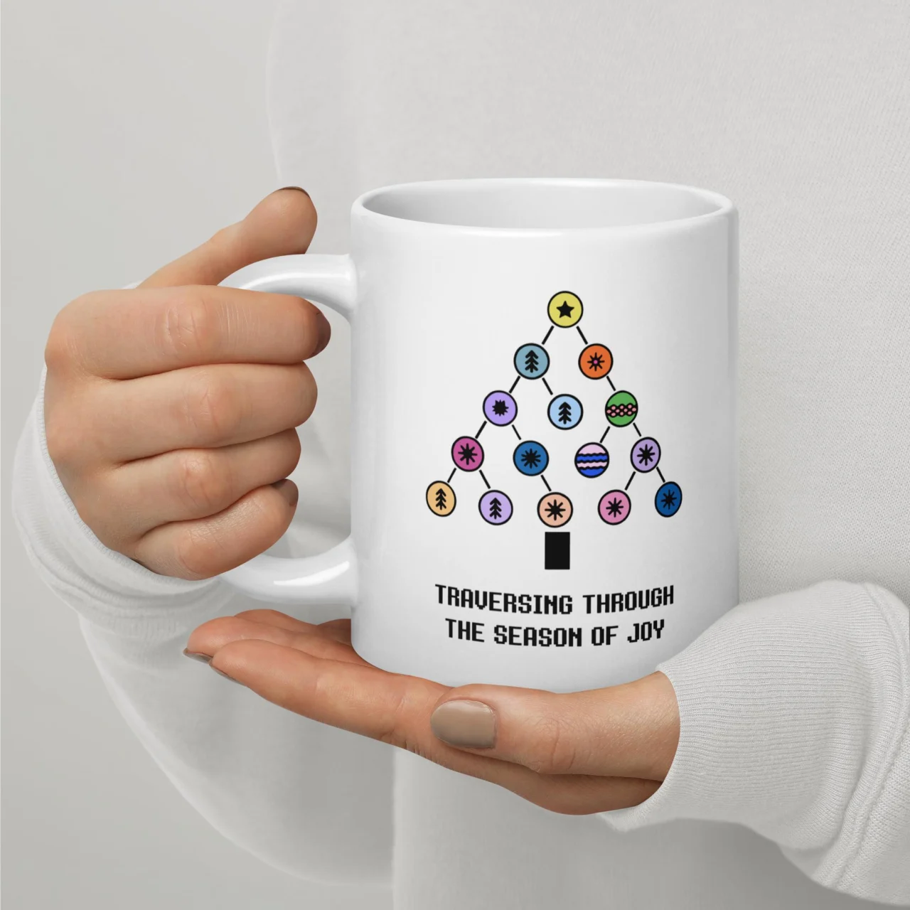 The perfect way for any computer scientist to celebrate the holidays! This ceramic mug features a decorated Binary Tree, illustrating the concept of “Traversing Through the Season of Joy“.