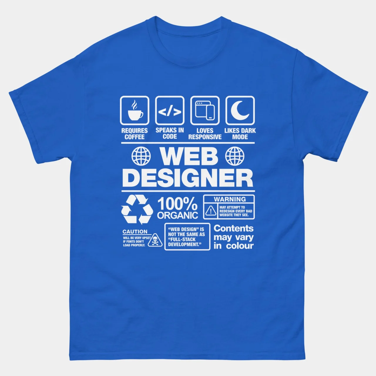 Web designers, this one’s for you! Whether you’re aligning pixels or battling broken layouts, this t-shirt speaks your language. Celebrate your love for responsive design, hex codes, and the thrill of a well-built website with this witty web designer tee.
