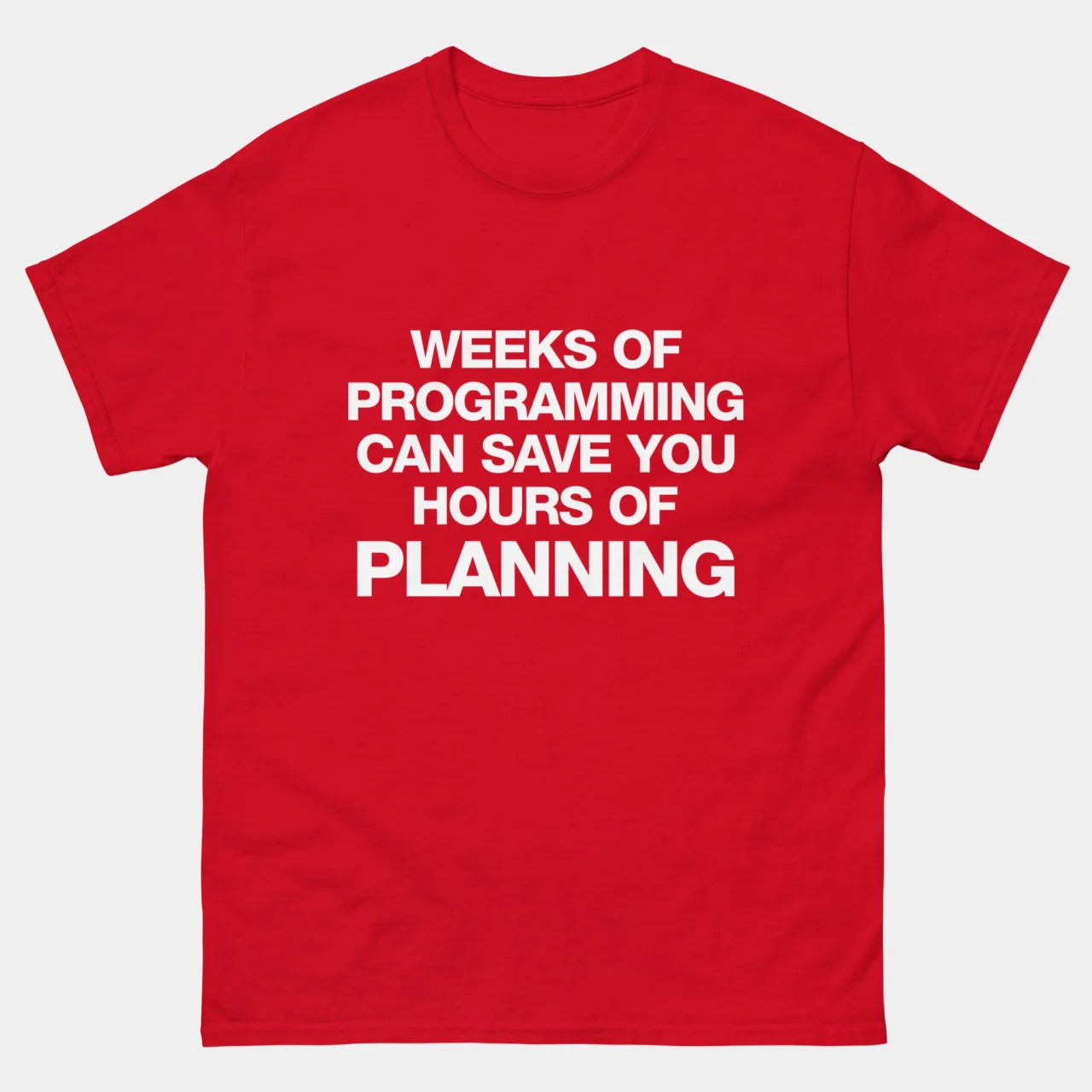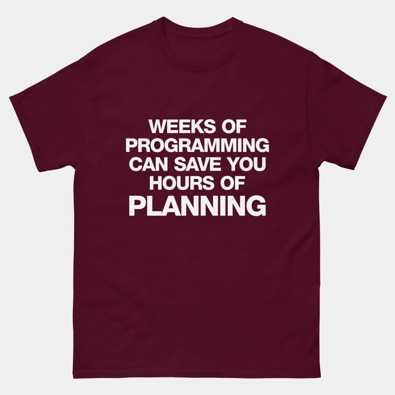 Weeks of Coding Can Save Hours of Planning T-Shirt: Why plan when you can just code? This funny programmer t-shirt captures the sarcasm of every developer who’s ever jumped straight into coding instead of planning—and then regretted it later.