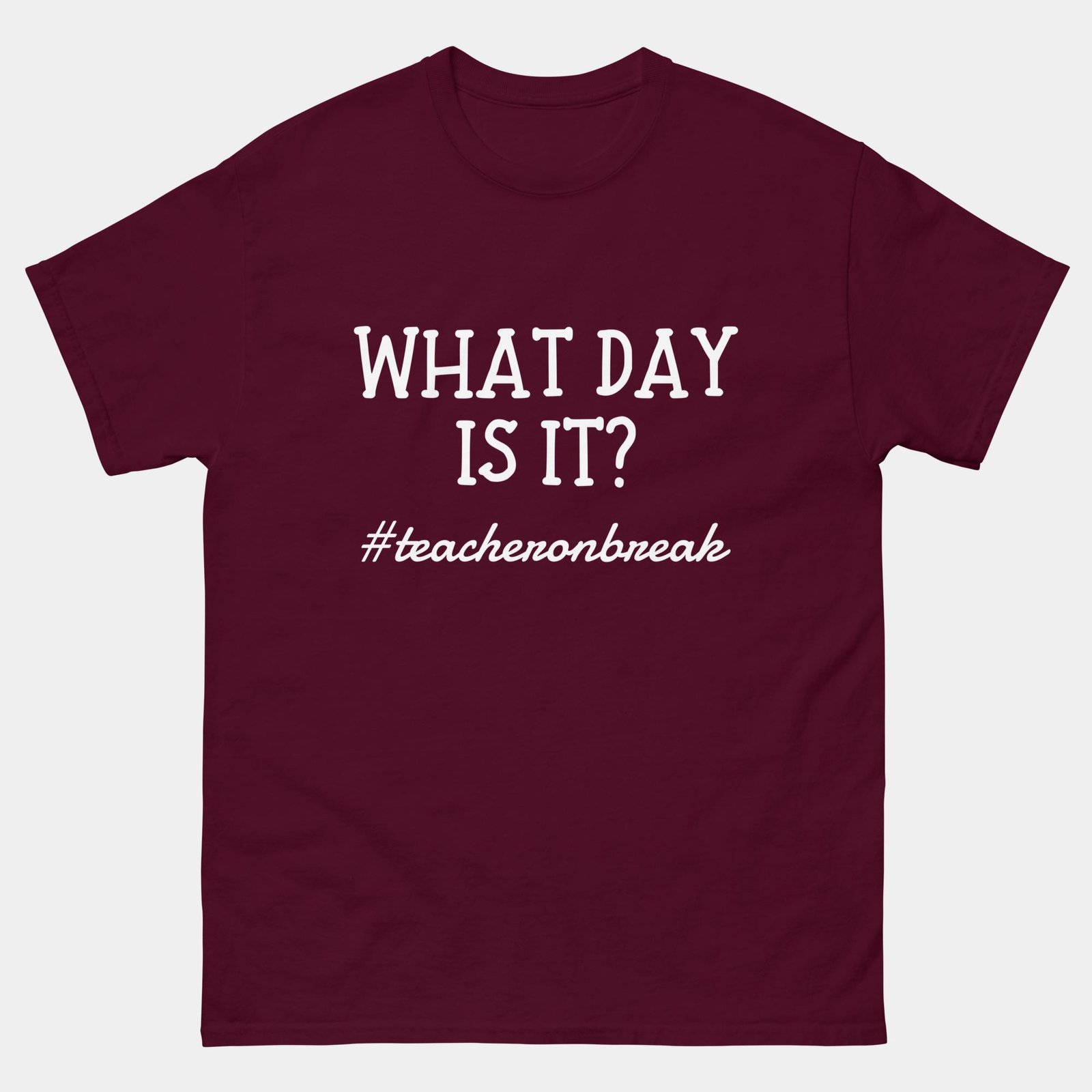 What Day Is It Teacher On Break Funny T-Shirt – Summer Vacation Teacher Shirt – End of School Break Tee – Classic Unisex Heavy Cotton T-Shirt by TechGeeksApparel: