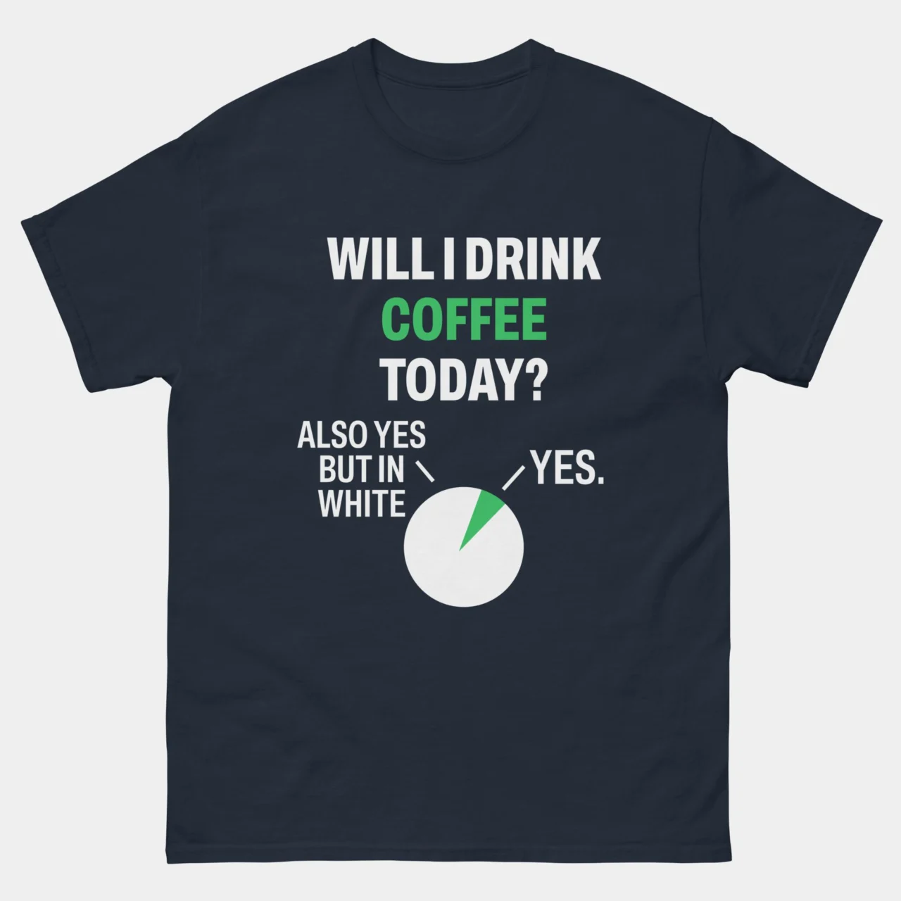 The most accurate data visualization ever created for the morning hours. This classic black Will I Drink Coffee Today T-Shirt features a hilarious pie chart that simplifies your daily decision-making process down to two identical choices: