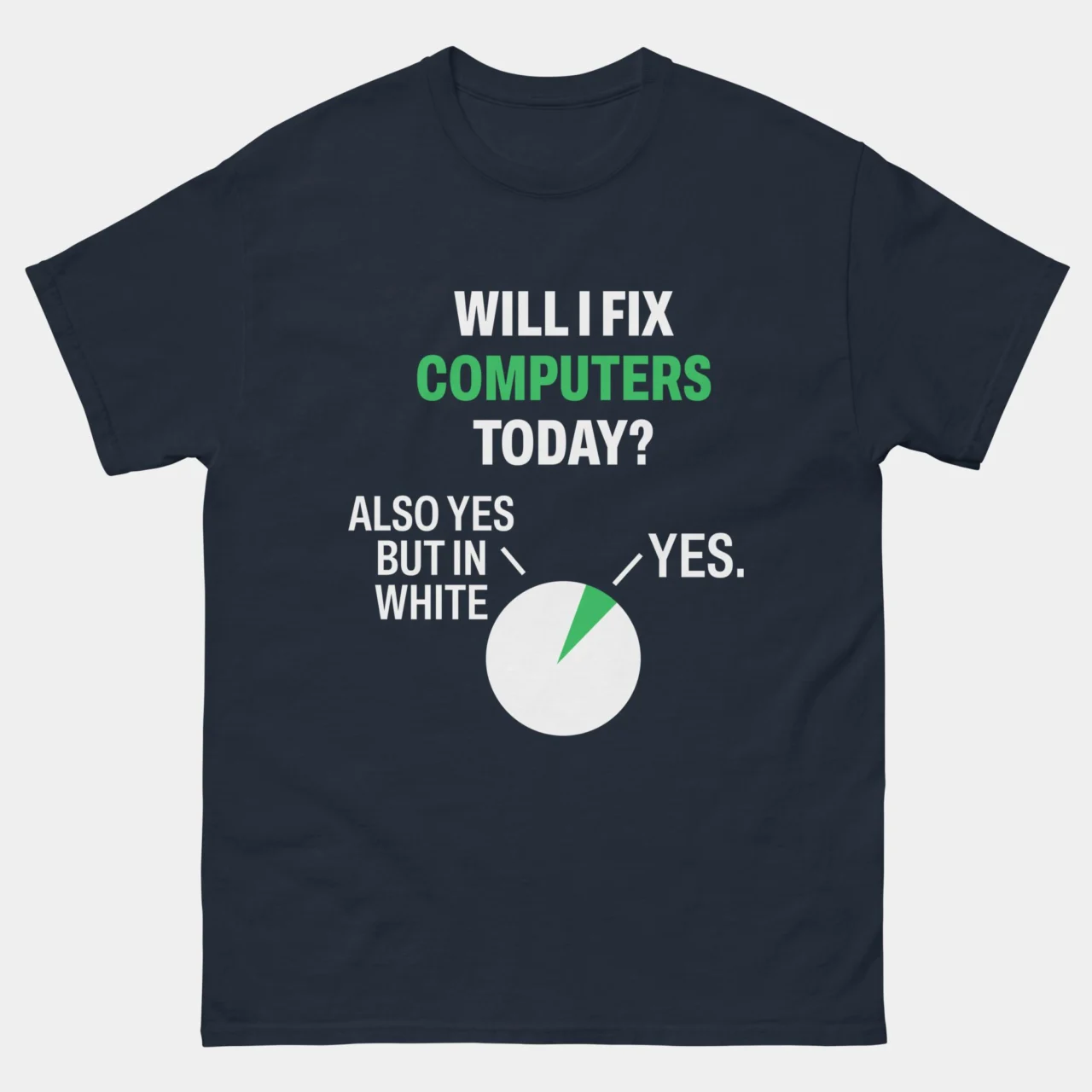 The only chart that accurately predicts an IT specialist’s calendar. This classic black Will I Fix Computers Today Funny IT T-Shirt features a hilarious pie chart that highlights the inevitable task facing every tech expert: