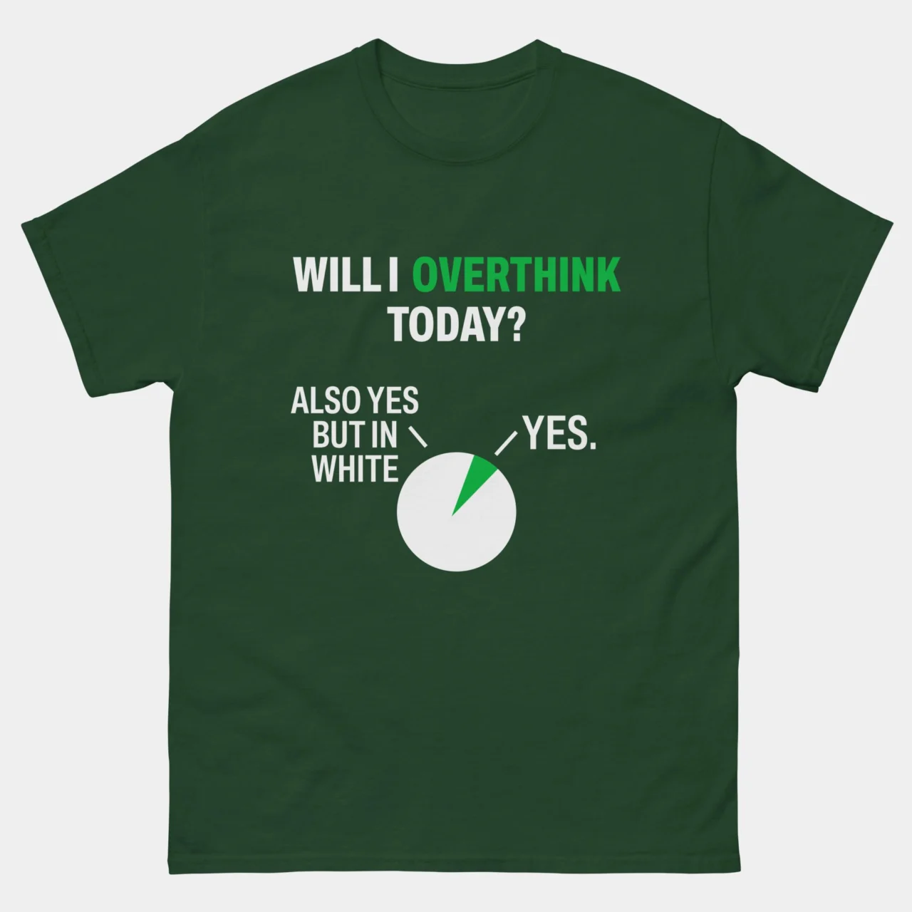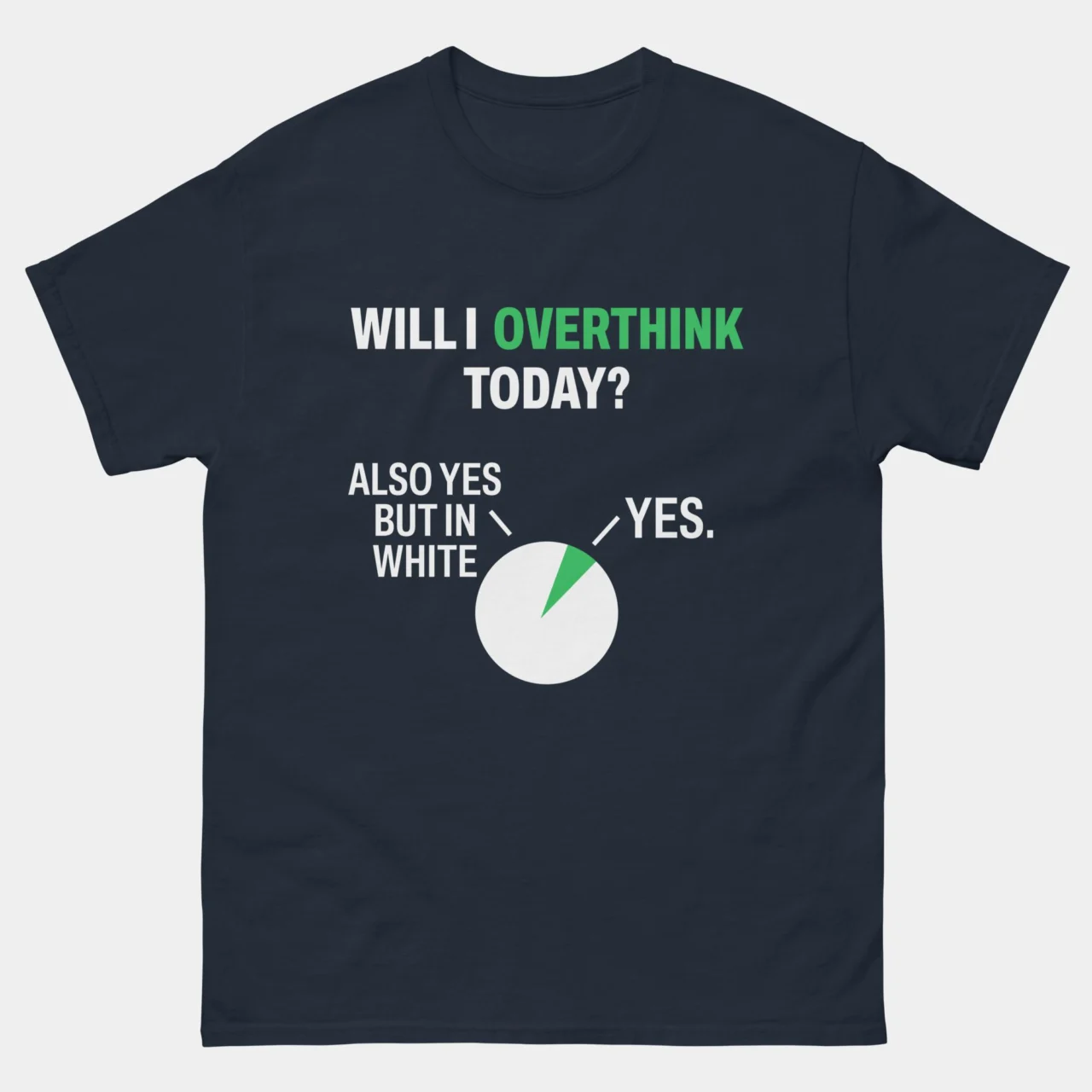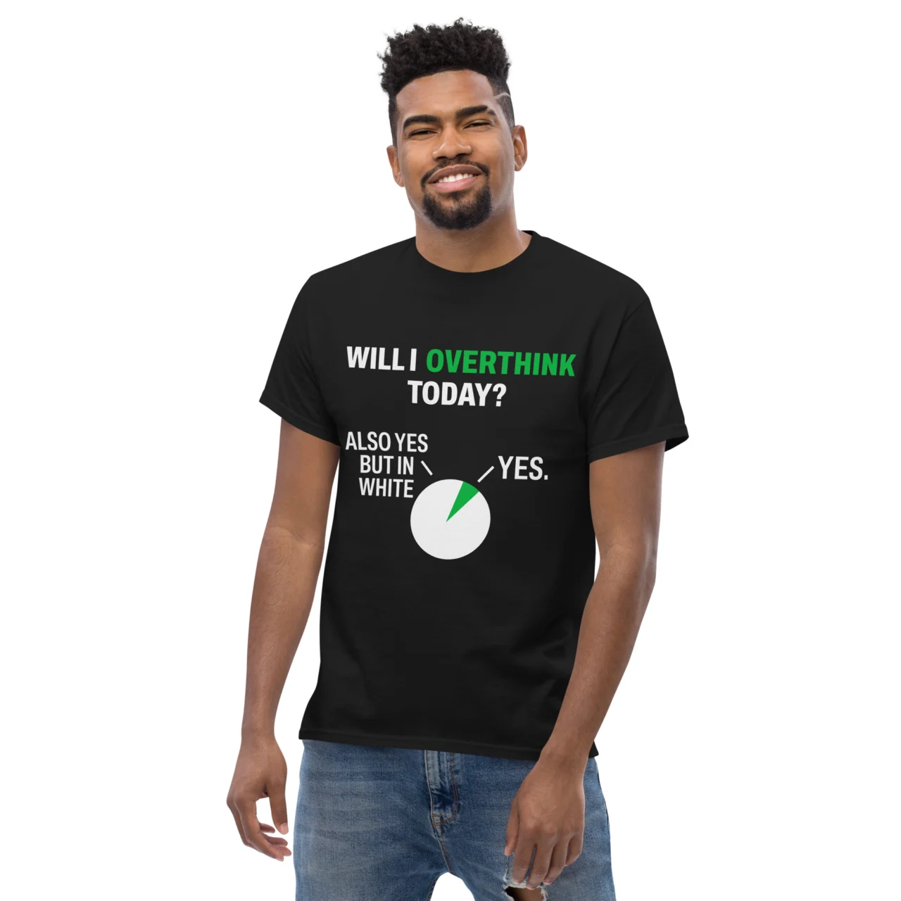 The forecast for today is 100% chance of mental marathons. This classic black Will I Overthink Today T-Shirt features a hilarious pie chart that proves there really is no other option:
