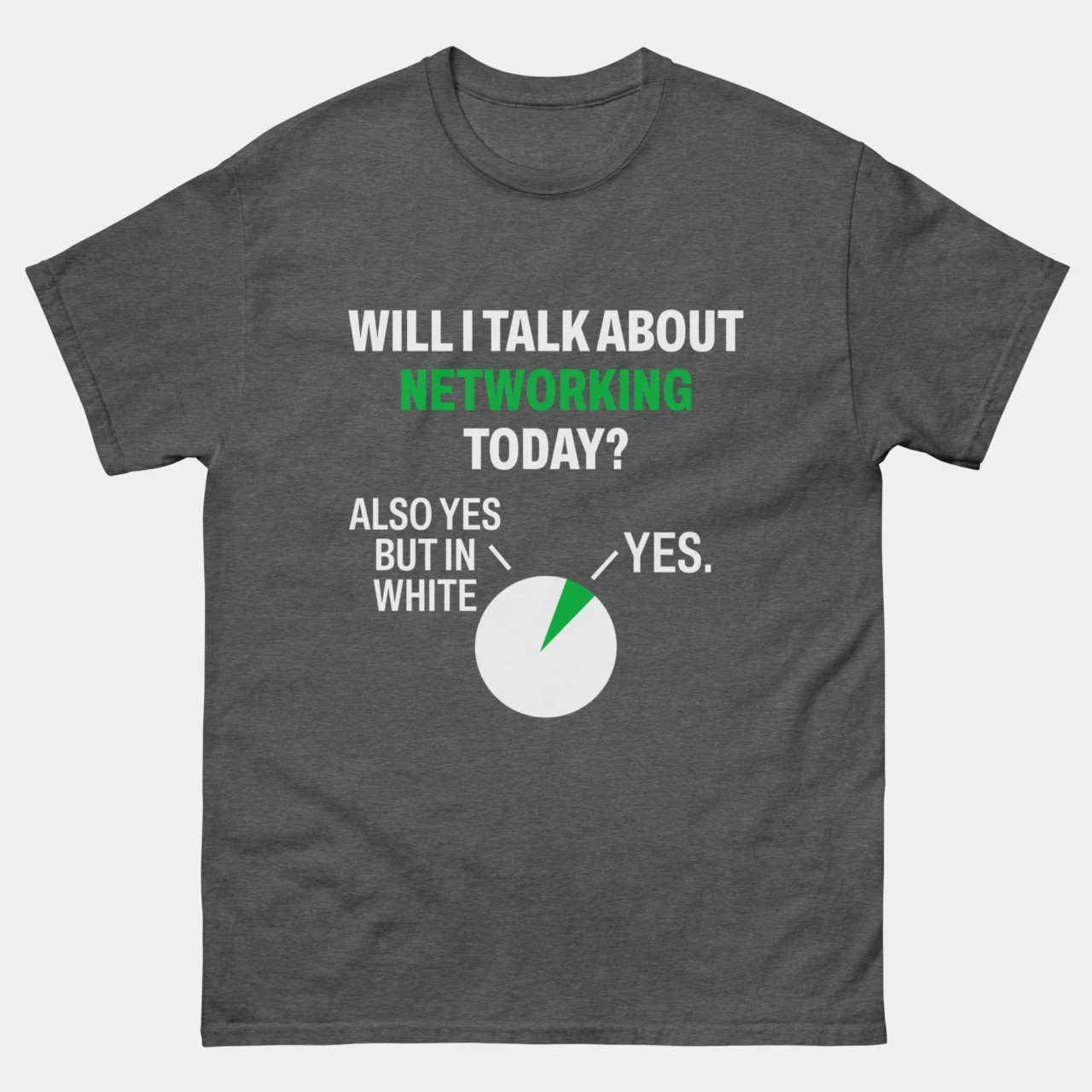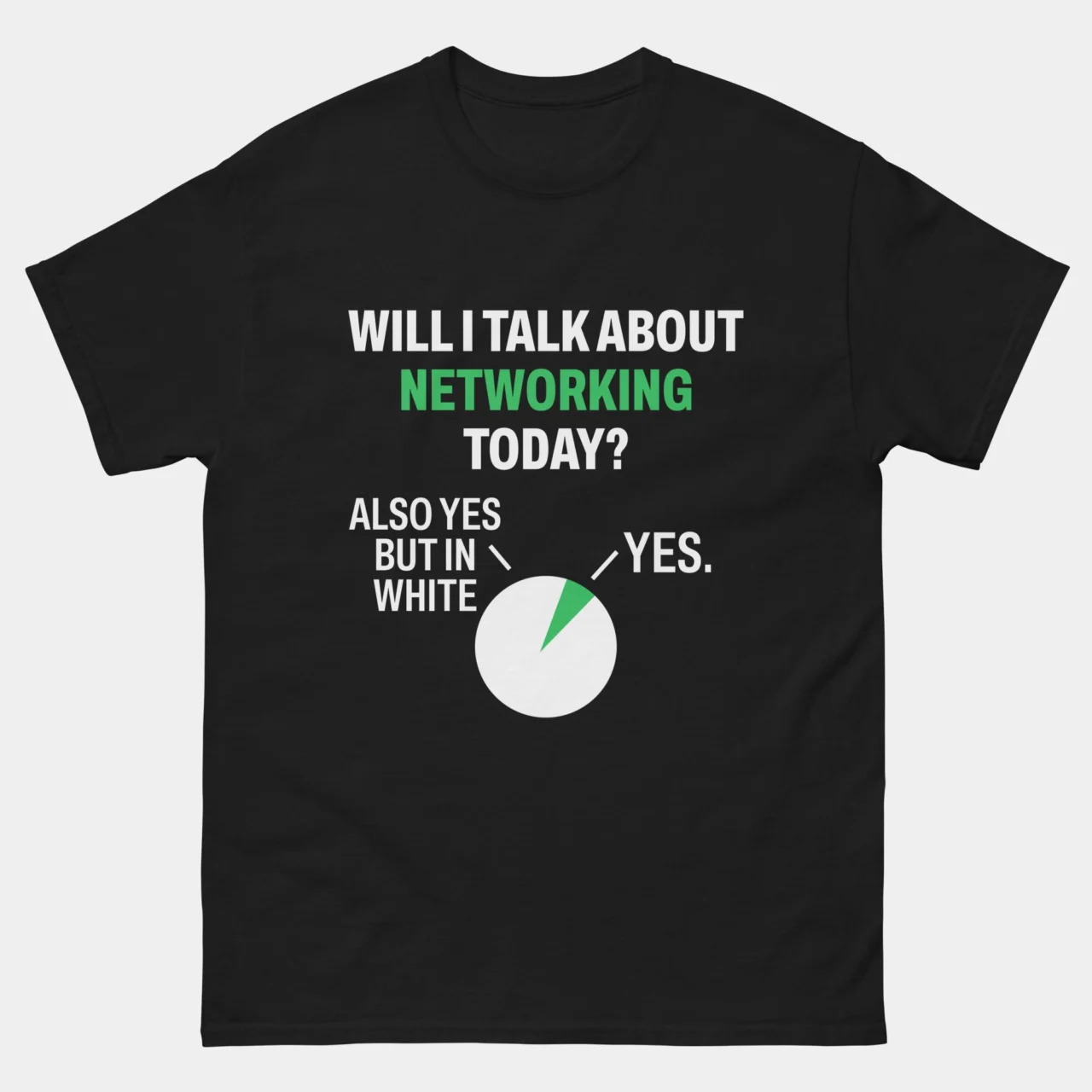 The forecast for today is 100% chance of talking about packets, protocols, and pings. This classic black Will I Talk About Networking Today T-Shirt features a hilarious pie chart that reveals the inevitable truth about a tech specialist’s conversation habits: