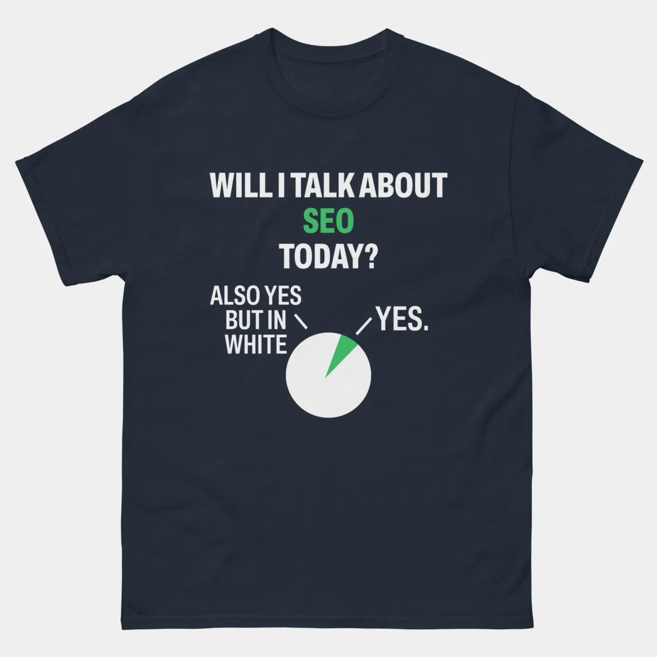 The forecast for today is a 100% chance of talking about backlinks, metadata, and the latest algorithm update. This classic black Will I Talk About SEO Today T-Shirt features a hilarious pie chart that reveals the inevitable truth about an SEO pro’s conversation habits: