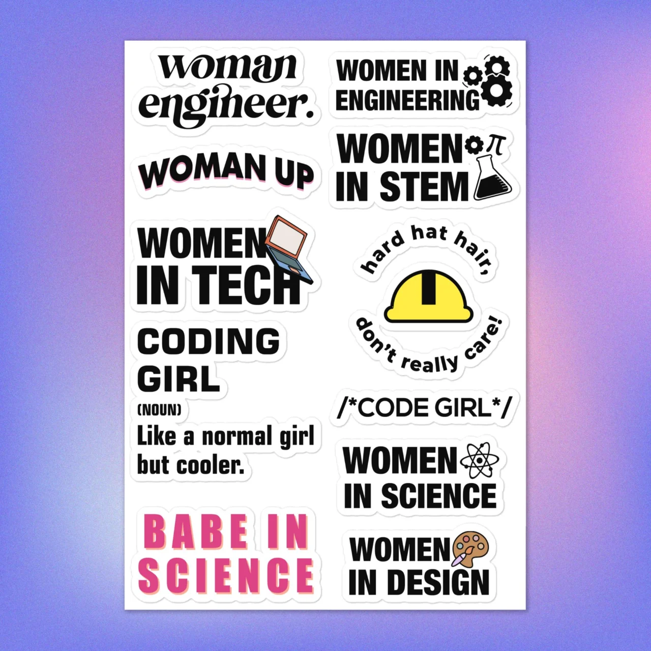 This sheet is packed with empowering, witty sayings, including: the confident “Hard Hat Hair Don’t Really Care,” the clever “Coding Girl Like a Normal Girl but Cooler,” and strong statements like “Women in Engineering,” “Woman Up,” and “Babe in Science.” It’s the perfect way to display your pride in your field!