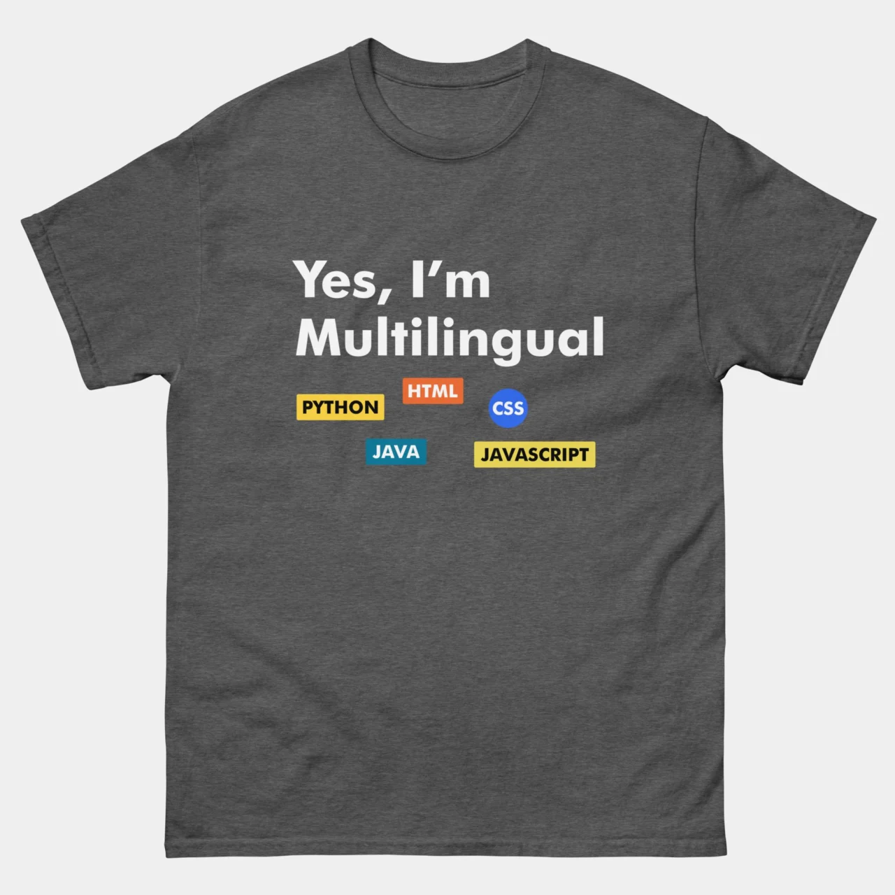 Some people speak multiple languages, but you speak JavaScript, Python, HTML, CSS, and Java. This funny programming t-shirt is perfect for coders, software developers, and full-stack engineers who juggle multiple programming languages daily.