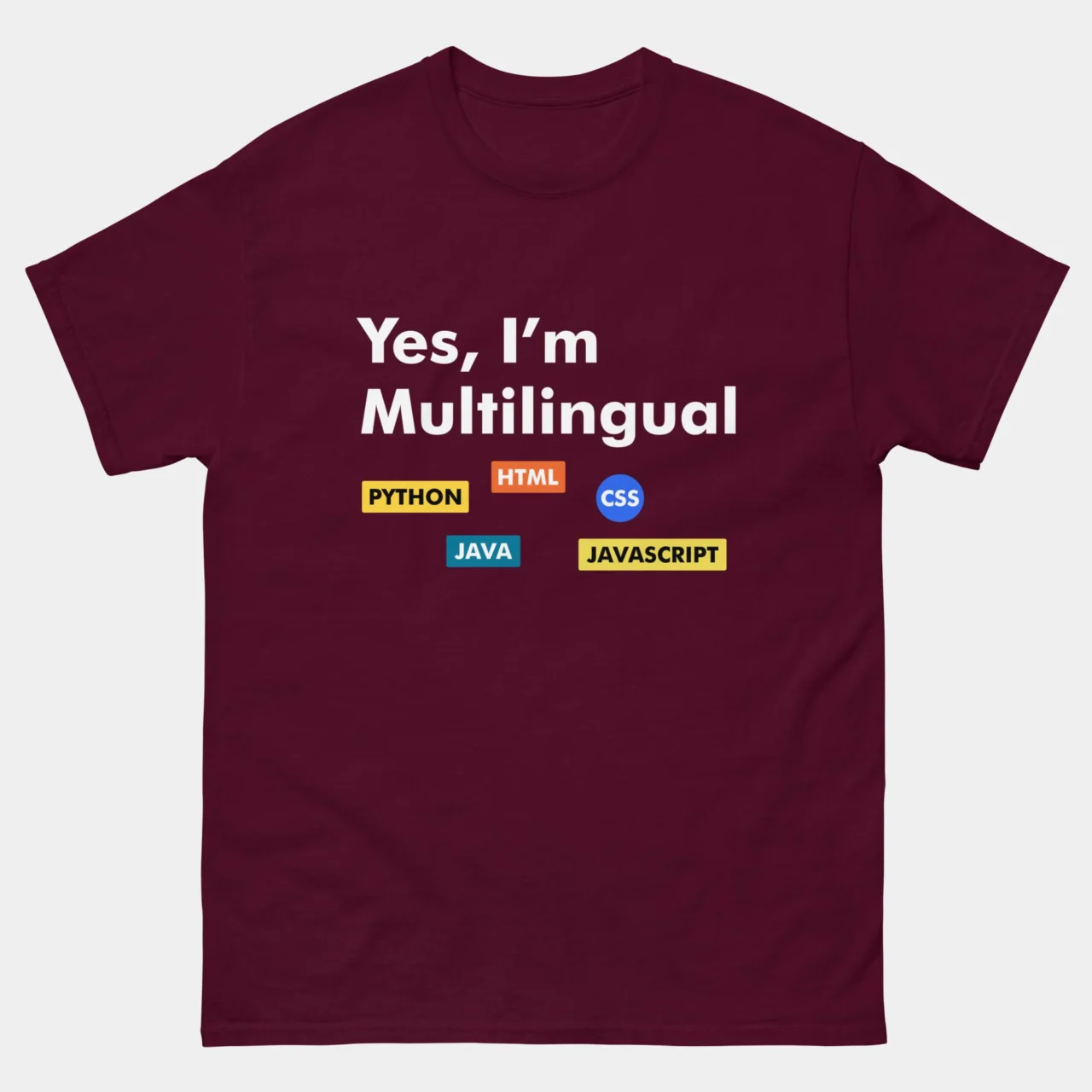 Yes I Am Multilingual T-Shirt – Funny Programmer Shirt – HTML, CSS, Java, Javascript, Python, Coding Languages Tee – Developer Humor – Software Engineer Gift – IT Geek Apparel – Classic Unisex Heavy Cotton T-Shirt by Tech Geeks Apparel: