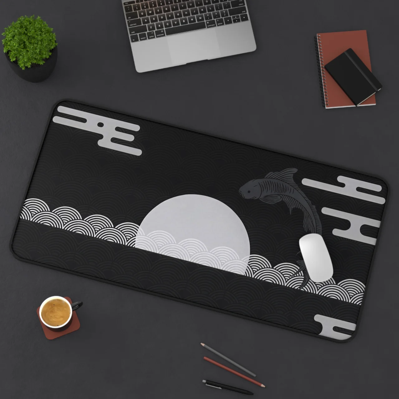 Zen Koi Moon Desk Mat, Japanese Aesthetic Mousepad, Minimalist Black & Grey Desk Pad, XL Extended Gaming Mat, Traditional Oriental Art Office Decor