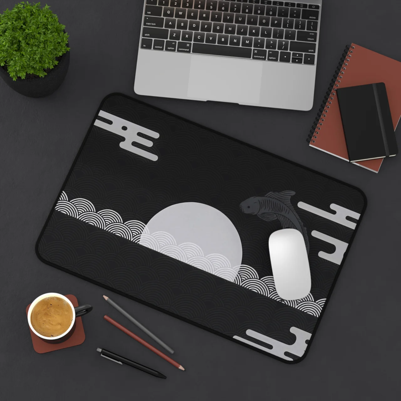Find your focus in the calm of the moon. This Zen Koi Moon desk mat combines traditional Japanese symbolism with a sleek, modern monochrome palette. Featuring a graceful koi fish and stylized wave patterns, it brings a sense of balance and tranquility to any high-performance workstation.